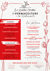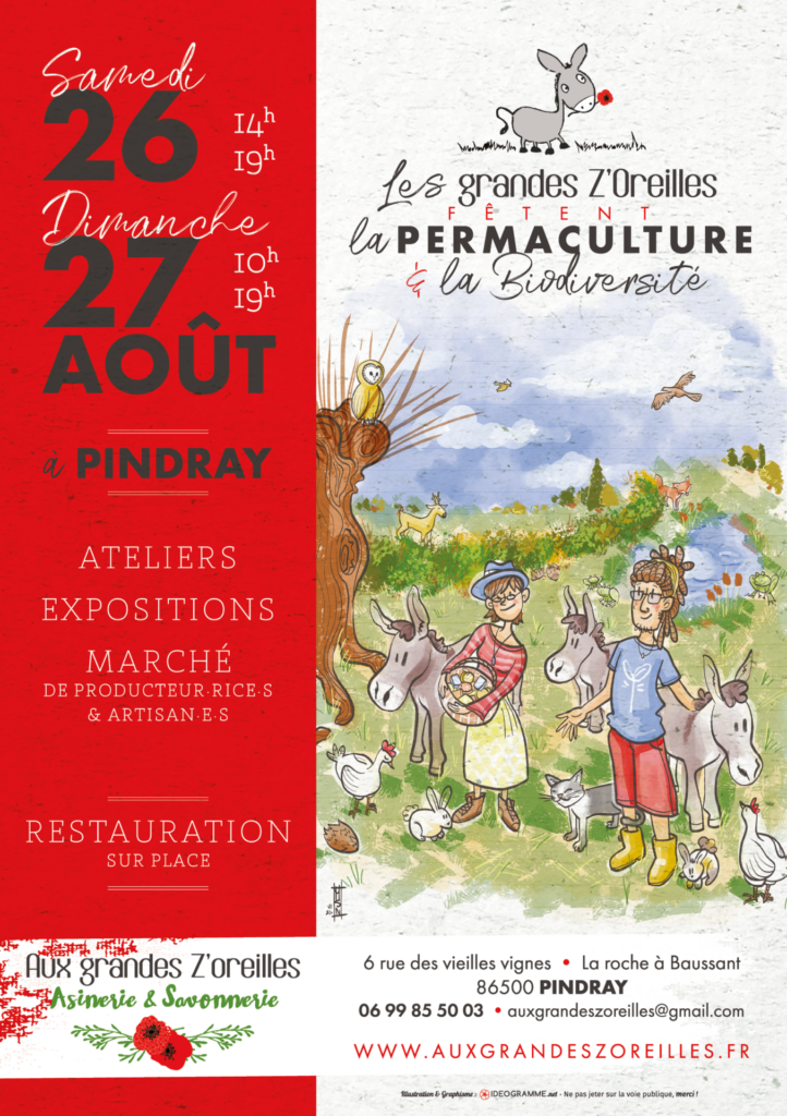 – Fête de la permaculture et de la biodiversité à l’asinerie « Les grandes Z’oreilles » de Pindray, samedi 26 (de 14 h à 19 h) et dimanche 27 août. (de 10 h à 19 h)