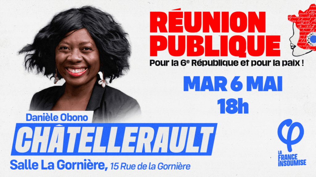 Mardi 6 mai à 18 h : Réunion publique « Pour la 6e République et pour la paix » avec Danièle Obono, députée insoumise de Paris.
