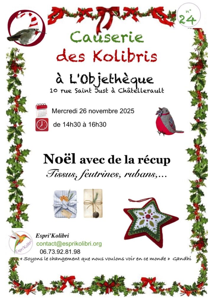 Dans le cadre de la semaine européenne de réduction des déchets, les Kolibris partagent leurs expériences pour fabriquer de jolies décorations de Noël ou pour emballer les cadeaux avec du tissus et des rubans de récup. C’est à l’Ojethèque-café de Châtellerault (quartier du lac).