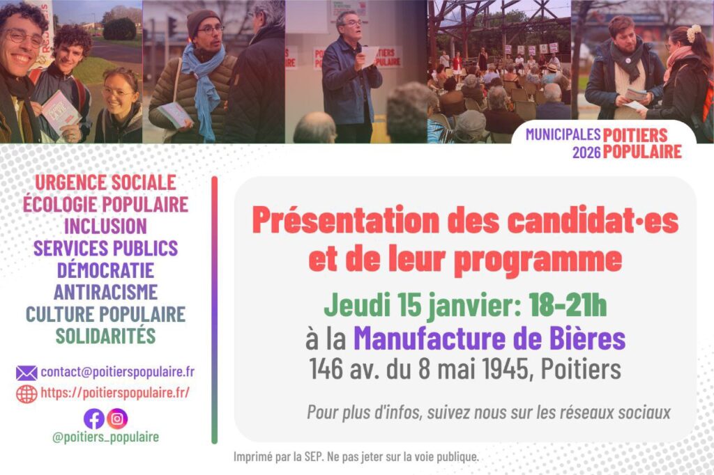 Venez nous retrouver le jeudi 15 janvier 2026 à la Manufacture de bières pour une présentation de nos candidat.es et du programme. Plus d’informations : https://poitierspopulaire.fr/le-15-janvier-une-nouvelle-etape-pour-poitiers-populaire/