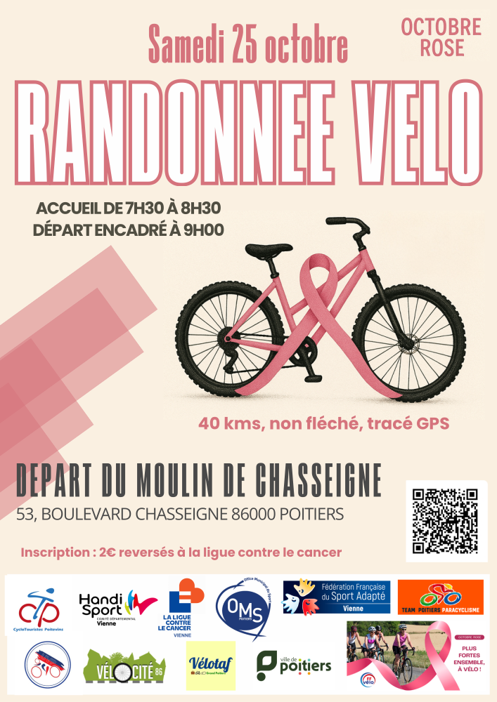 Dans le cadre d’octobre rose, les Cyclotouristes Poitevins s’associent avec l’Office Municipal du Sport de Poitiers, l’Union Vélocipédique Poitevine, Vélotaf Grand Poitiers, Vélocité 86, Poitiers Paracyclisme, le Comité départemental des sports adapté de la Vienne 86 et le Comité Départemental Handisport Vienne en proposant une randonnée vélo le samedi 25 octobre ouvert à tous !