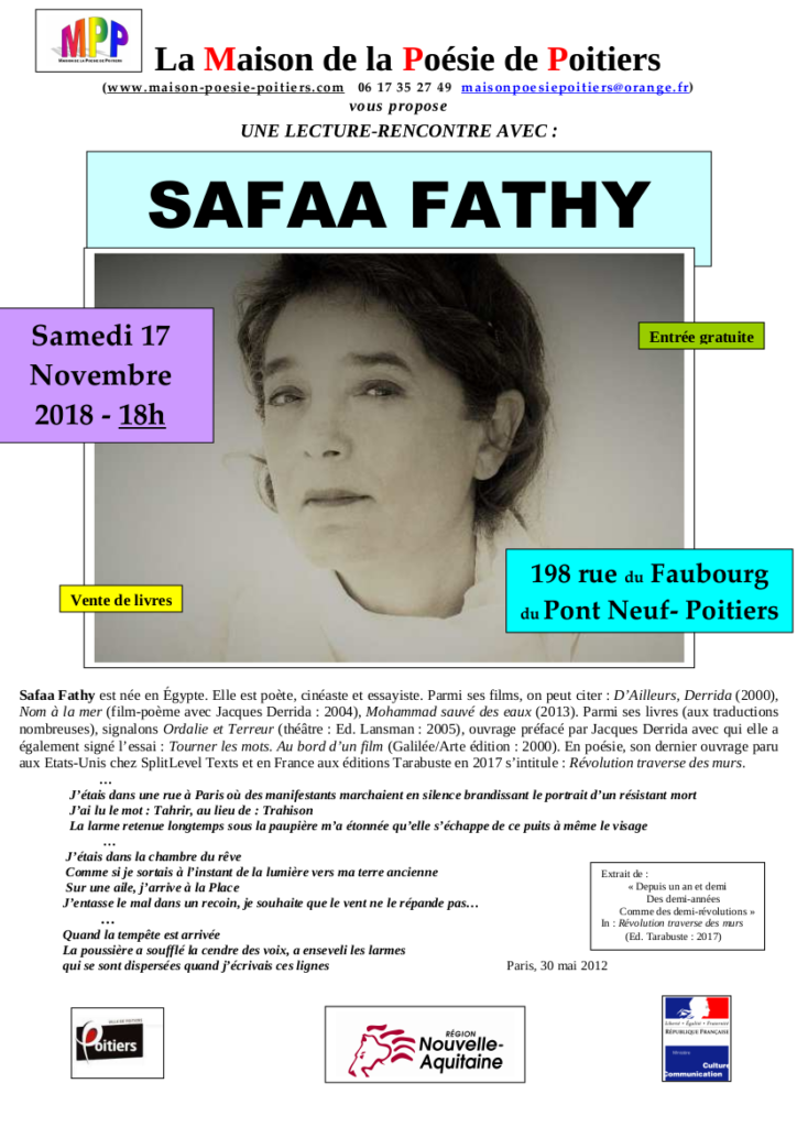 Safaa Fathy est née en Égypte. Elle est poète, cinéaste et essayiste. Parmi ses films, on peut citer : D’Ailleurs, Derrida (2000), Nom à la mer (film-poème avec Jacques Derrida : 2004), Mohammad sauvé des eaux (2013). Parmi ses livres (aux traductions nombreuses), signalons Ordalie et Terreur (théâtre : Ed. Lansman : 2005), ouvrage préfacé par Jacques Derrida avec qui elle a également signé l’essai : Tourner les mots. Au bord d’un film (Galilée/Arte édition : 2000). En poésie, son dernier ouvrage paru aux Etats-Unis chez SplitLevel Texts et en France aux éditions Tarabuste en 2017 s’intitule : Révolution traverse des murs.