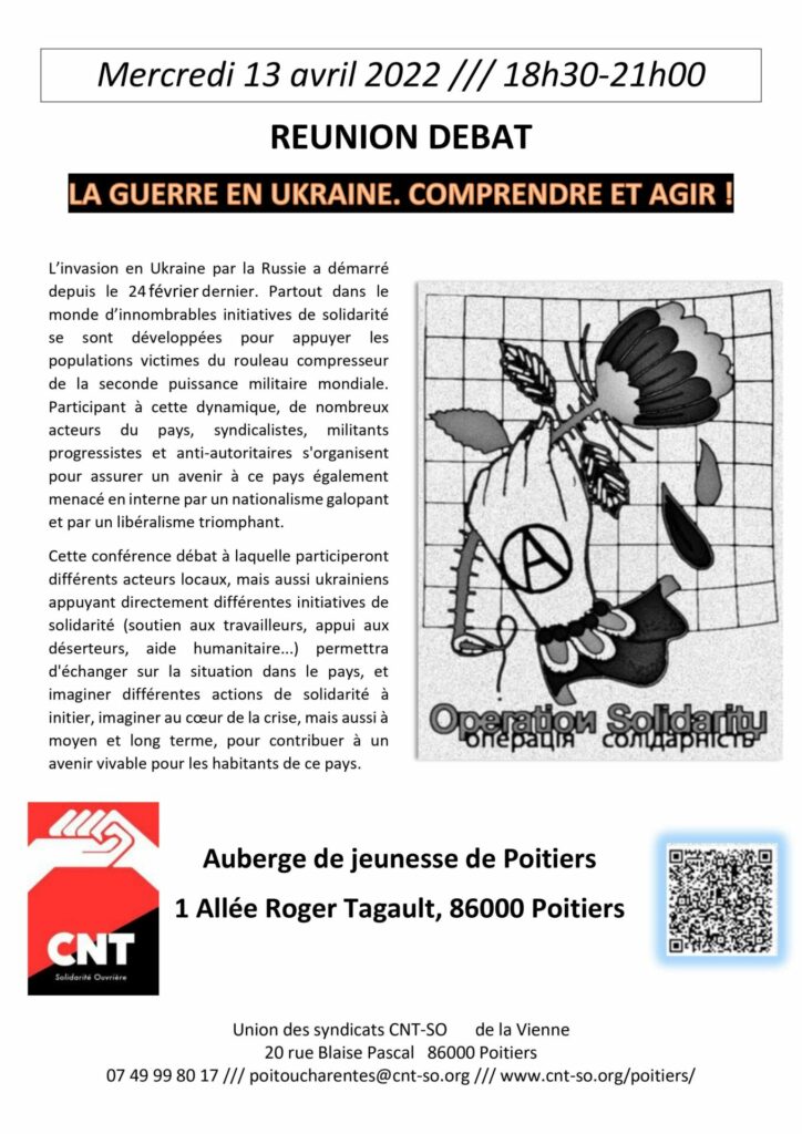 Face à l’Invasion d’une partie l’Ukraine par l’armée et l’impérialisme de Poutine, la CNT-SO de la Vienne propose une soirée d’échanges, témoignages et débat sur les résistances ukrainiennes et russes face à la guerre.