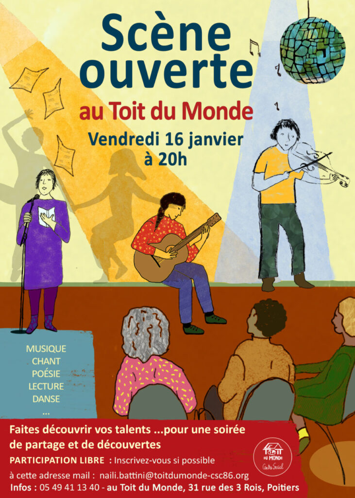 Vendredi 16 janvier à 20 h : Scène ouverte au Toit du Monde. Au programme, musique, chant, danse, poésie…