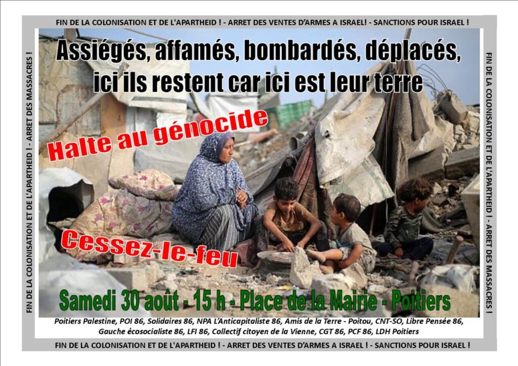 Rejoignez-nous samedi place de la mairie à Poitiers pour réclamer l’arrêt des massacres et des sanctions contre l’État israélien !