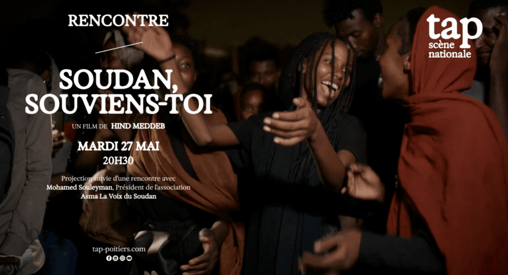 Mardi 27 mai à 20h30 au TAP Castille : ciné-débat autour du documentaire Soudan, souviens-toi (Documentaire, France/Tunisie, 2025, 1h16, V.O.S.T.F.) de la réalisatrice Hind Meddeb. La projection sera suivie d’un échange avec Mohamed SOULEYMAN, Président de l’association Asma La Voix du Soudan.
