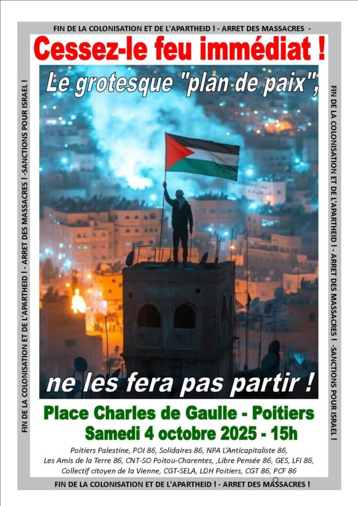 Soutien à la Palestine : 4 octobre à Poitiers Détails de l'événement Date: 4 octobre 2025 15:00 – 17:00 Rassemblement et manifestation à Poitiers : samedi 4 octobre à 15 h, place du marché (place Charles de Gaulle). Partager : Cliquez pour partager sur Facebook(ouvre dans une nouvelle fenêtre) Facebook Cliquer pour envoyer un lien par e-mail à un ami(ouvre dans une nouvelle fenêtre) E-mail Cliquez pour partager sur LinkedIn(ouvre dans une nouvelle fenêtre) LinkedIn Cliquez pour partager sur Telegram(ouvre dans une nouvelle fenêtre) Telegram Cliquez pour partager sur WhatsApp(ouvre dans une nouvelle fenêtre) WhatsApp Cliquer pour partager sur Mastodon(ouvre dans une nouvelle fenêtre) Mastodon Cliquer pour partager sur Bluesky(ouvre dans une nouvelle fenêtre) Bluesky