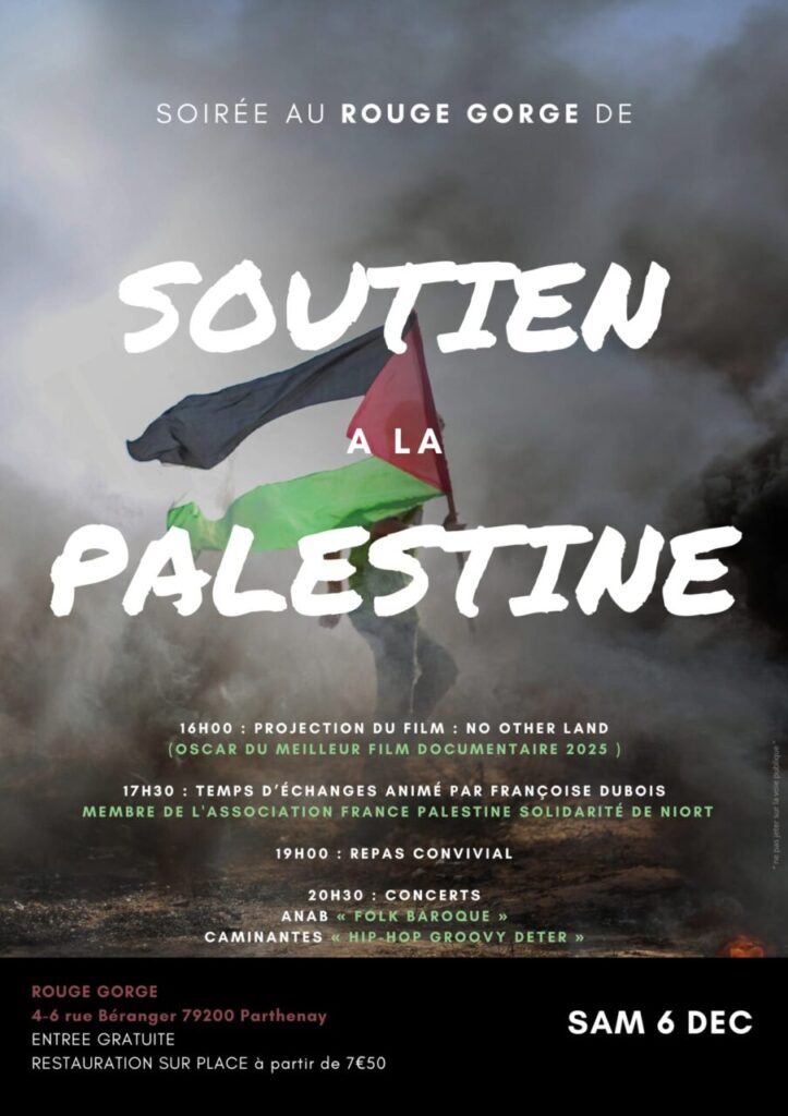 Samedi 6 décembre à partir de 16h au Rouge-Gorge à Parthenay : journée de soutien à la Palestine.