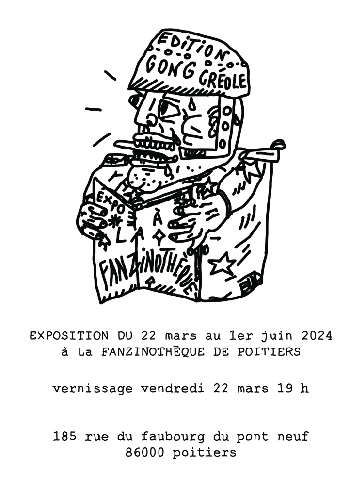 La Fanzinothèque invite « Gong Créole » à investir son espace d’expo. Gong Créole est une petite maison d’édition créée à Nantes en 2018 et spécialisée dans le multiple d’artistes et les livres uniques. Cofondateur et organisateur du BIB, festival de la micro-édition se déroulant aux ateliers de Bitche à Nantes, Gong Créole a été créée par l’artiste plasticien Budwarrior comme un laboratoire expérimental mêlant créations sur papier, culture créole et label de musique.