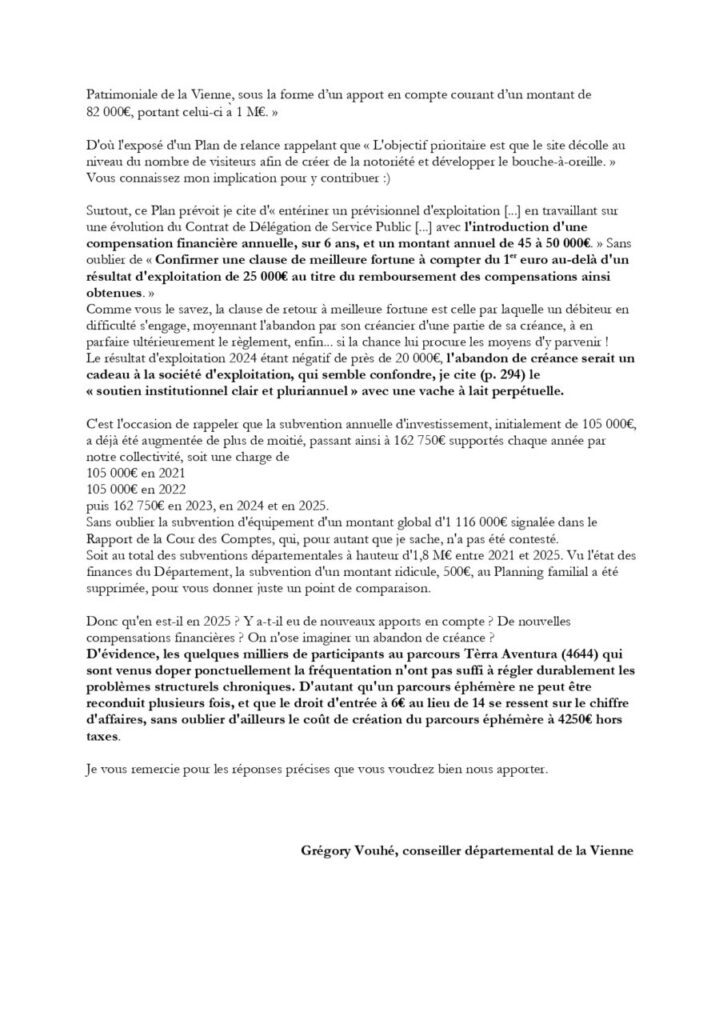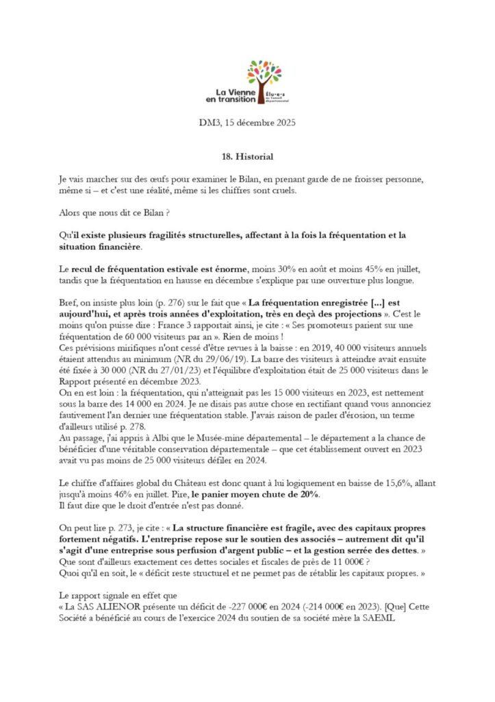 Intervention, ci-dessous, de Grégory Vouhé pour le groupe d’opposition « La Vienne en transition » lors de la séance du Conseil départemental de la Vienne du 15 décembre. Où il est question du bilan comptable 2024 (qui arrive bien tard…) de l’Historial/château de Monts-sur-Guesnes…