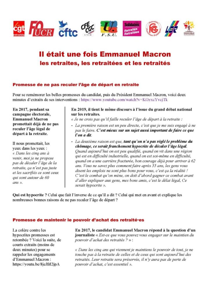 Tel est le titre du texte/communiqué du « Groupe des 9 » regroupant une grande partie des retraité.e.s au travers des organisations syndicales. Ce texte est relayé localement par la section de la Vienne de la Fédération Générales des Retraité.e.s. Il dit les choses clairement sur les mensonges, les approximations et la duplicité permanente du macronisme.