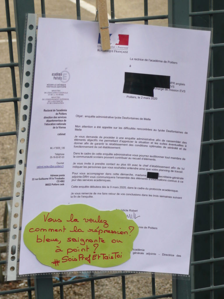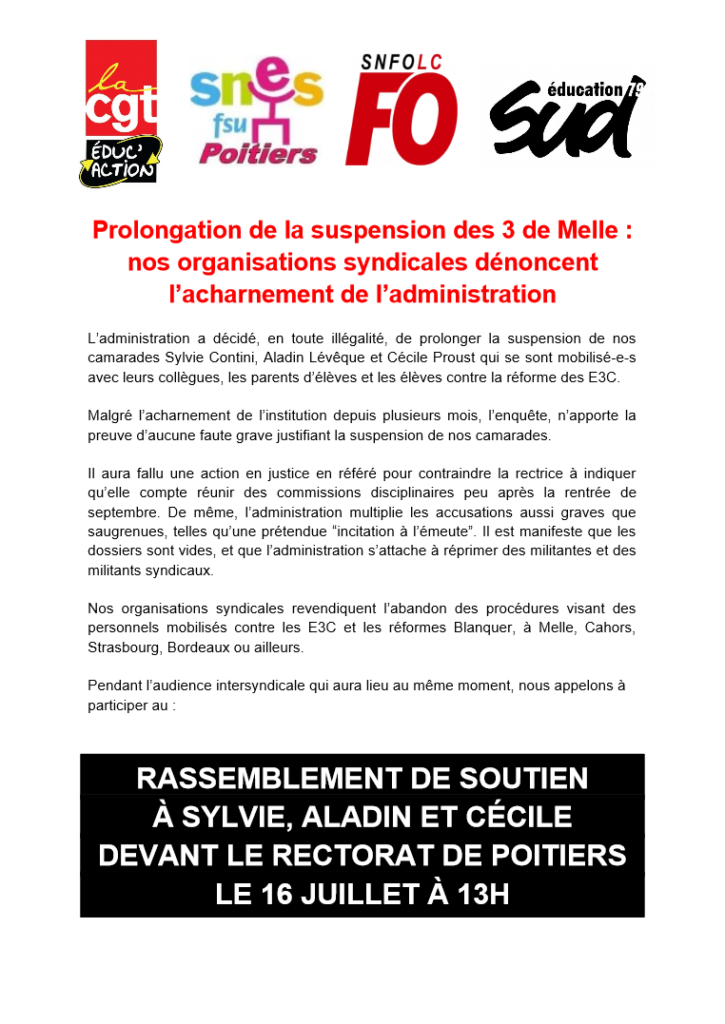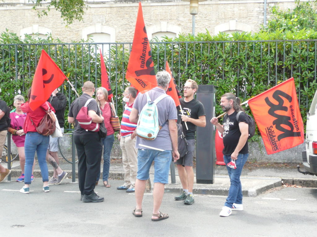 Le 16 juillet 2020 se sont réunis devant le rectorat de Poitiers environ 180 à 200 personnes, pour réclamer justice pour Aladin, Cécile et Sylvie, les 3 profs de Melle qui font l’objet de sanctions arbitraires de suspension de la part de Mme le Recteur d’académie.