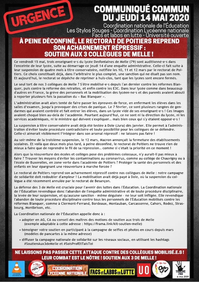 L’enquête administrative contre 3 enseignant-es qui avaient protesté contre le nouveau bac E3C en début d’année 2020 est relancée dès la 1ère semaine de déconfinement et d’organisation de la « réouverture » des écoles . Les services académiques ont décidément de bien étranges priorités…