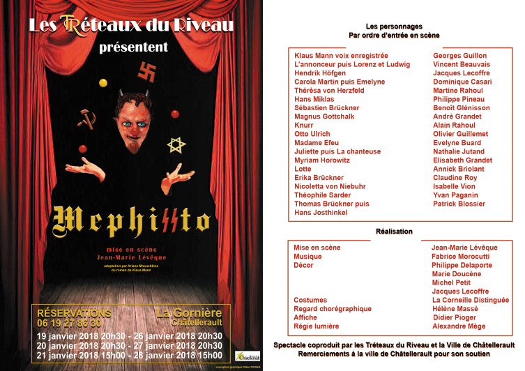 La section de Châtellerault de la LDH soutient le spectacle « Méphisto », d’après le roman de Klaus Mann adapté par Ariane Mnouchkine, joué par la troupe châtelleraudaise « Les Tréteaux du Riveau ».