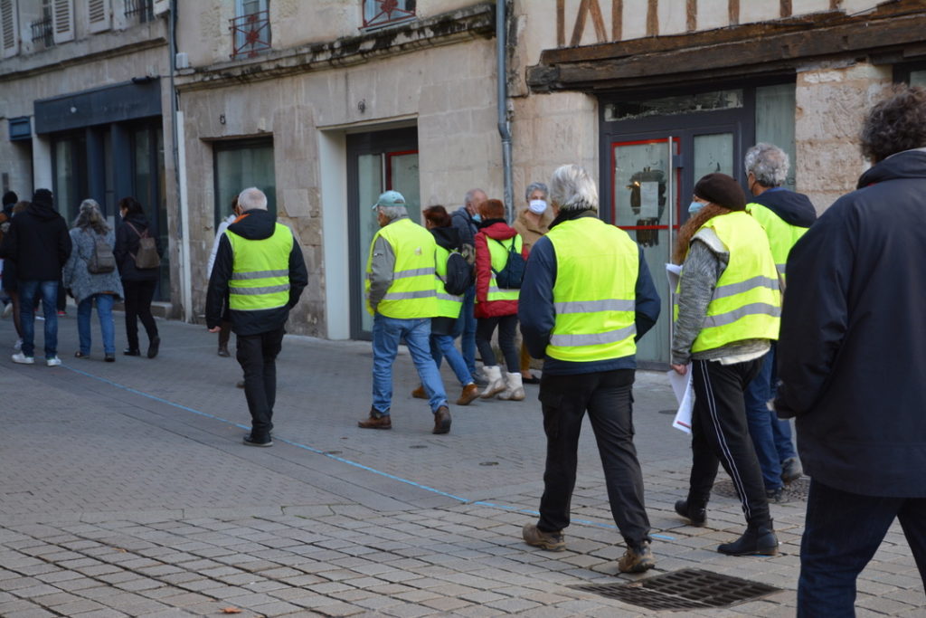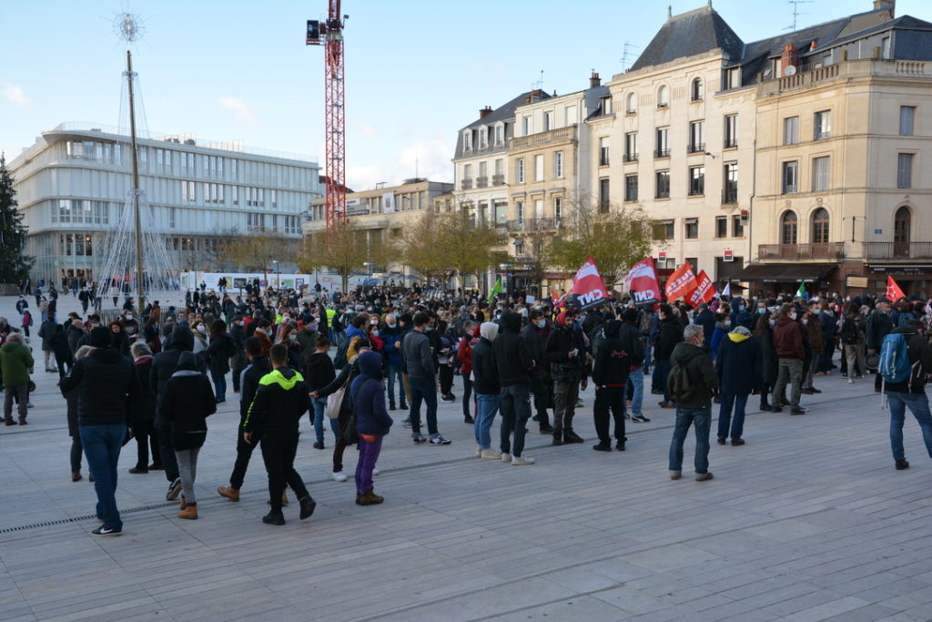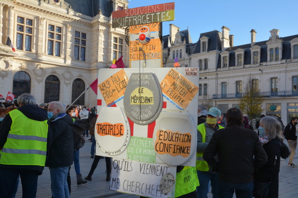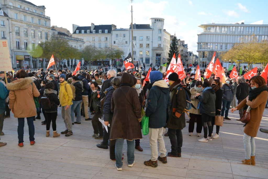A 15 h, ça se rassemble doucement, la foule grossit lentement, il fait beau avec le vent qui agite les drapeaux toujours nombreux sur la place de la mairie de Poitiers. Alors, 700 ? 800 ? Pas moins que la semaine dernière et France 3 Poitou-Charentes annonce même 1 000 au journal télévisé du soir.