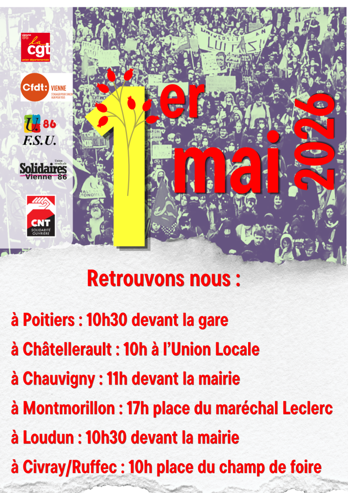 10h30. Manifestation. Gare, Préfecture, Place Lepetit. Après la manifestation, stand syndicaux et associatifs rue de la Regratterie.