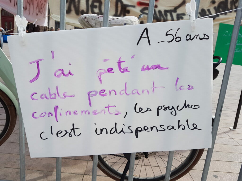 La manifestation s’est poursuivie sur le parvis du CHU l’après-midi. La majorité des manifestant-e-s étaient des psychologues salarié-e-s, exprimant leur ras-le-bol devant le mépris des autorités qui n’augmentent pas les moyens humains devant l’explosion des besoins.