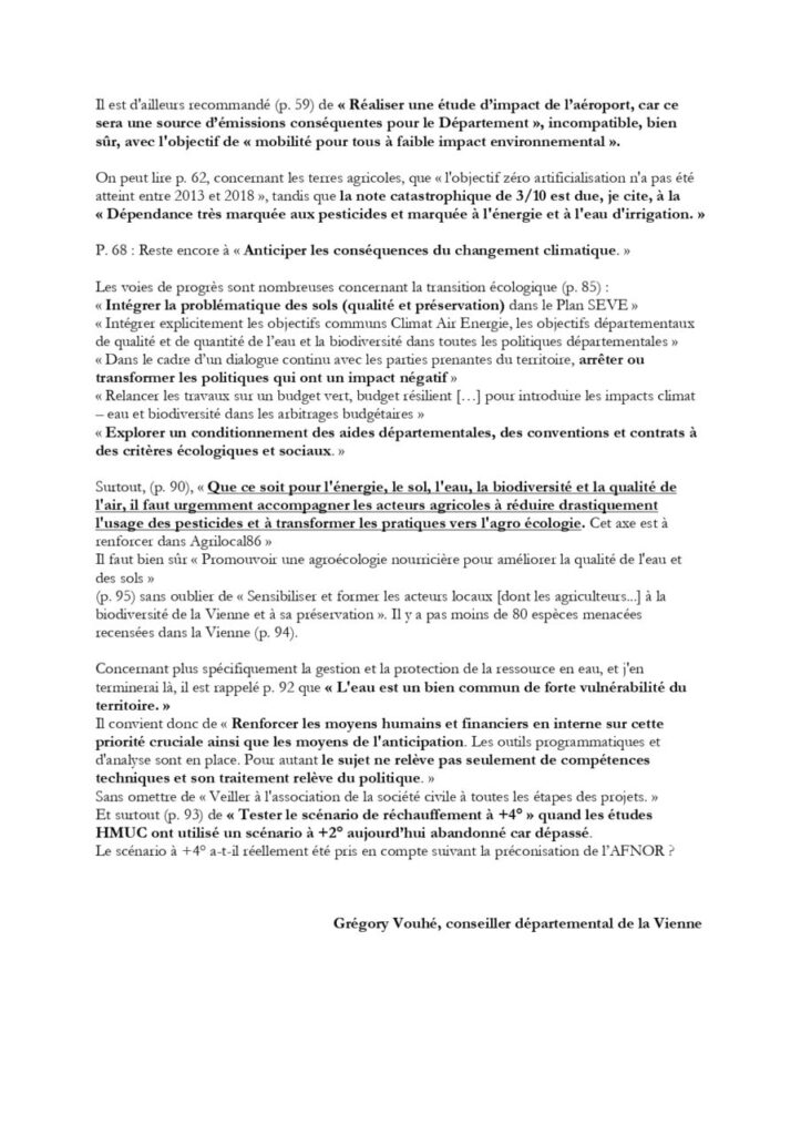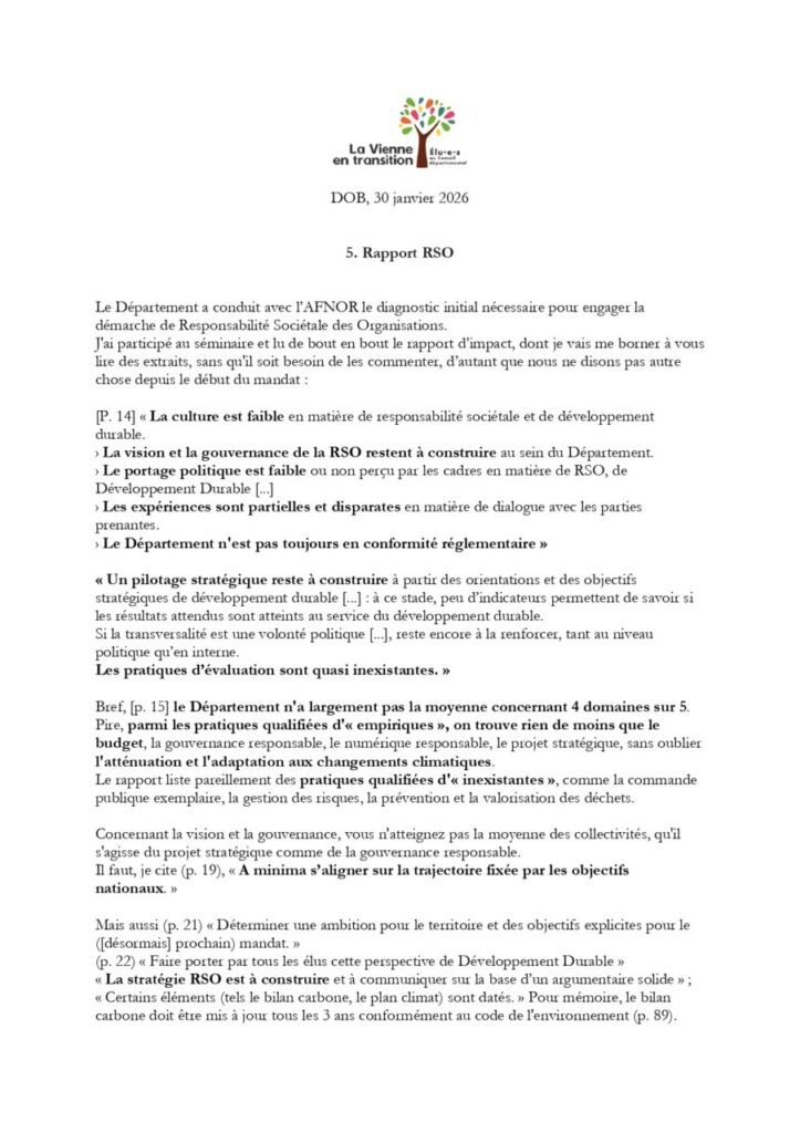 Comme il est précisé sur le site de la Vienne en transition à propos de cette commission permanente (https://www.vienne-en-transition.fr/index.php/2026/02/16/commission-permanente-du-30-janvier-2026-un-budget-sans-vision-et-un-rapport-rso-accablant/), « c’est Grégory Vouhé qui a traité un point critique de l’ordre du jour : la révélation du rapport RSO (Responsabilité Sociétale des Organisations), obligatoire pour les collectivités territoriales, et qui évalue la durabilité de leurs pratiques du point de vue social et environnemental. Un rapport remis par l’organisme de certification Afnor et qui figurait dans le livret de travail des élus, mais que la majorité départementale a omis de présenter en séance publique. En effet, le document démontre sur près de 90 pages les performances très insuffisantes du Département de la Vienne dans les domaines expertisés. »