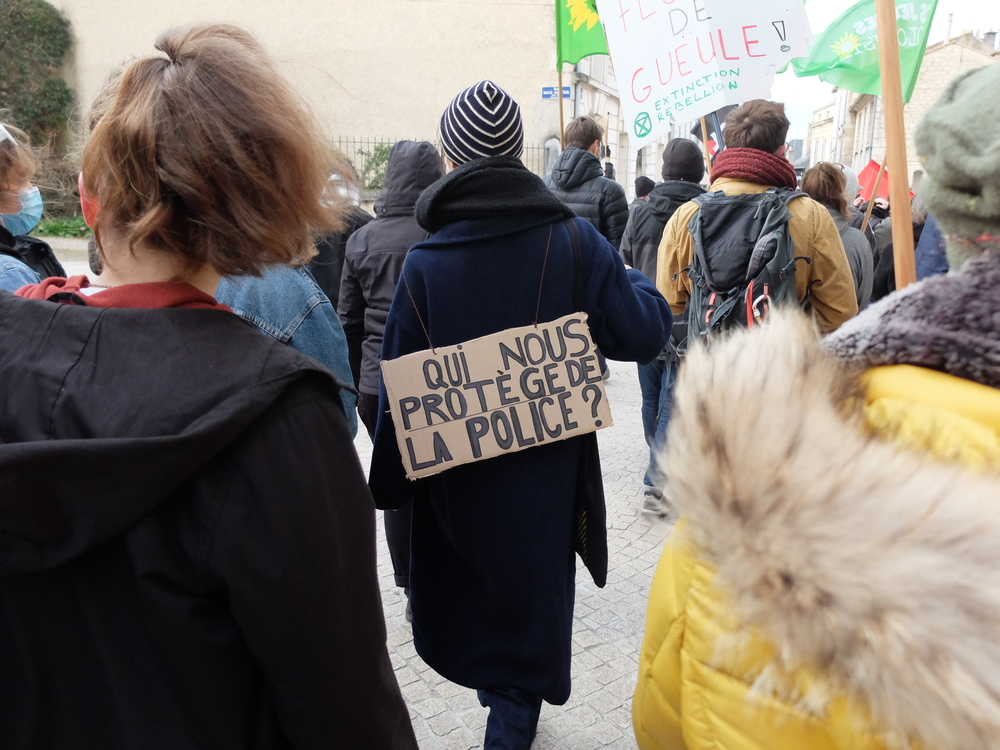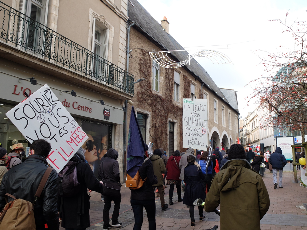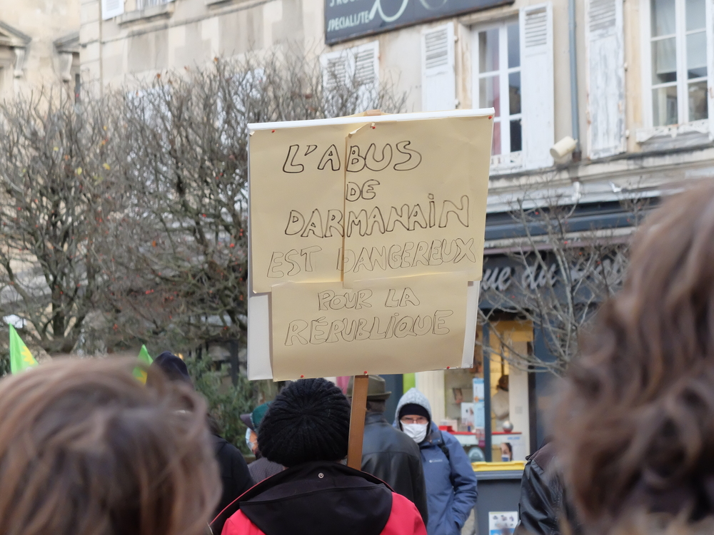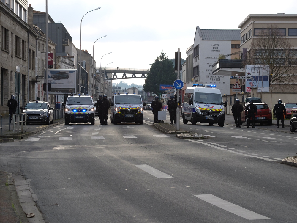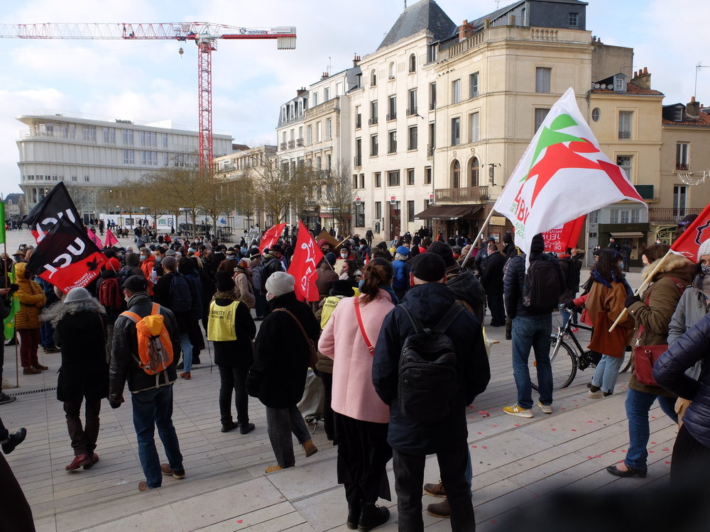 Beaucoup de drapeaux d’organisations, une belle et nouvelle banderole unitaire, pas mal de jeunes, un parcours inédit (Place d’Armes, place de la Liberté, Porte de Paris pour finir devant l’actuel Palais de justice), une présence policière complètement disproportionnée (les représentants locaux de Macron détestent tant que ça la rue, apparemment) et toujours le mélange dans les slogans entre celles et ceux qui s’adressent aux agissement de la police et celles et ceux qui visent la loi.