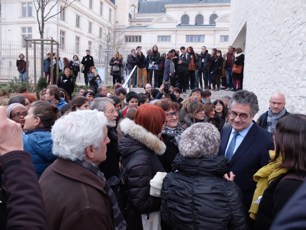 Le maire Alain Claeys est apparu par surprise, sorti de la mairie toute proche, pour expliquer que c’était le vœu du fils de Simone Veil, venu inaugurer le square récemment, de mettre « président » et non « présidentE »