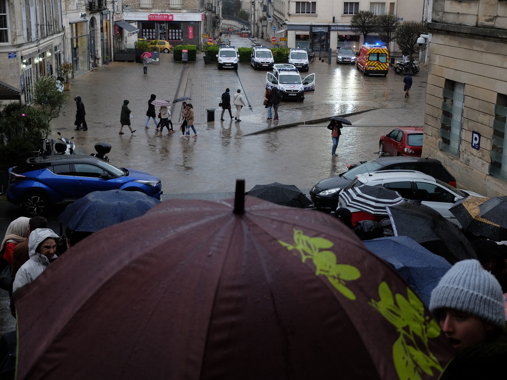 Le déluge faisait fuir les passant-es et la manifestation fut très arrosée.