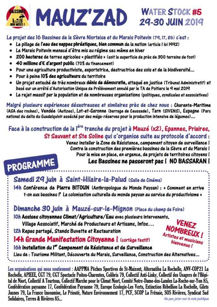 Avec le soutien de : AAPPMA Pêches Sportives de St-Maixent, Alternatiba La Rochelle, ANV-COP21 La Rochelle, APIEEE, CGT 79, CGT Spectacle Poitou-Charentes, Colibris 79, Collectif Anti-Linky, Collectif des Usagers de l’Hôpital de Niort, Collectif A Teurtous, Collectif Marche pour le Climat Niort, Comité Notre-Dame-des-Landes La-Roche-sur-Yon 85, Confédération paysanne 17, Confédération Paysanne 79, Europe Ecologie-Les Verts, Extinction Rébellion La Rochelle, Gilets Jaunes 79, La France Insoumise, Le Priouté, Nature Environnement 17, PCF 79, SCOP La Frênaie, SOS Rivières, Syndicat Sud Solidaires, Terres & Rivières 85…