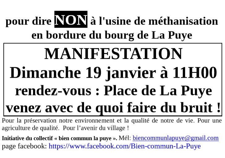 Après la réunion d’information qui a eu lieu le 10 janvier et qui a réuni un public nombreux (et inquiet) sur le projet d’usine de méthanisation en bordure du bourg, le collectif « Bien commun La Puye » appelle à une manifestation dimanche 19 janvier à 11 h. Rendez-vous sur la place du village.