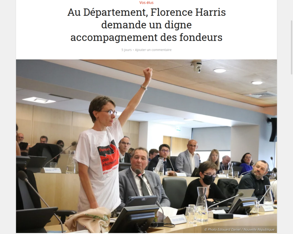 Nous vous recommandons la photo de Edouard Daniel/Nouvelle République dans l’article sur F. Harris et la tête des élu-es du Conseil Départemental de la Vienne qui regarde une élue poing levé !