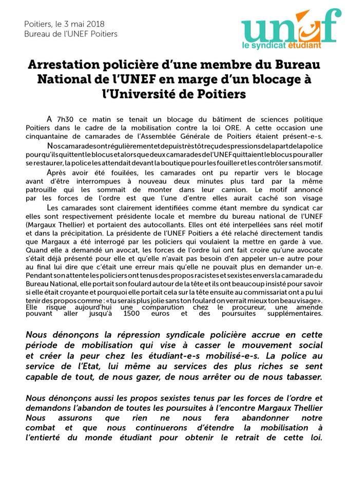 Communiqué de l’UNEF sur l’arrestation d’un membre de son bureau national à Poitiers