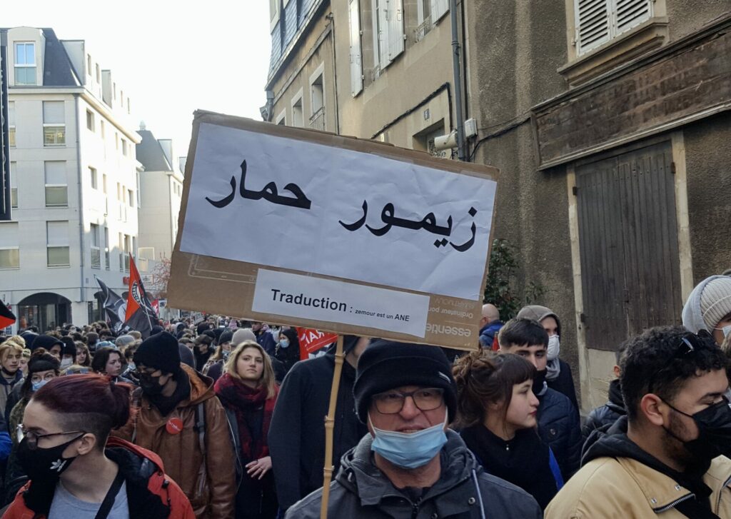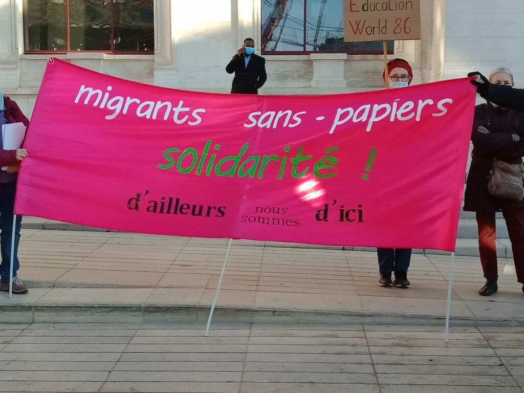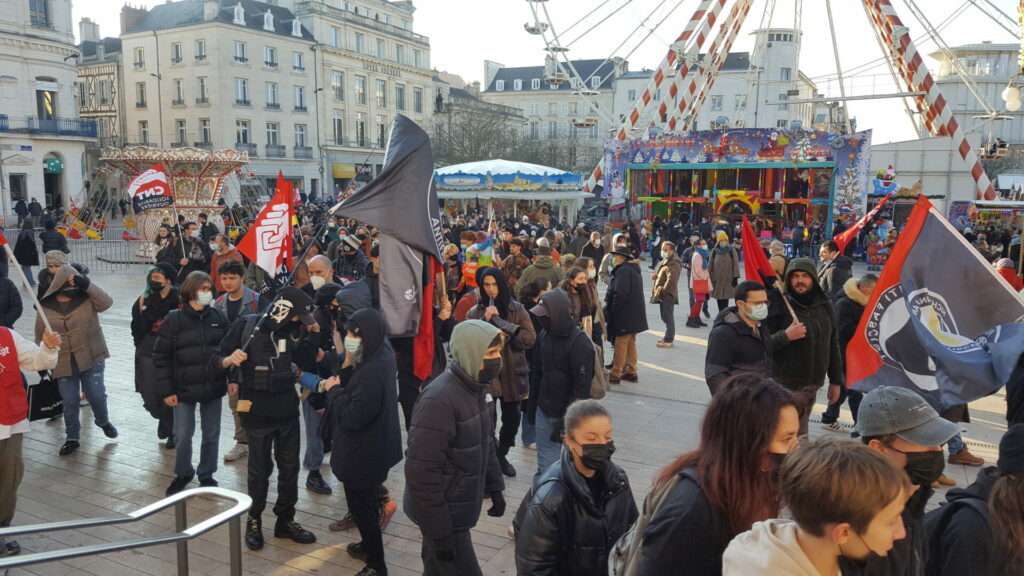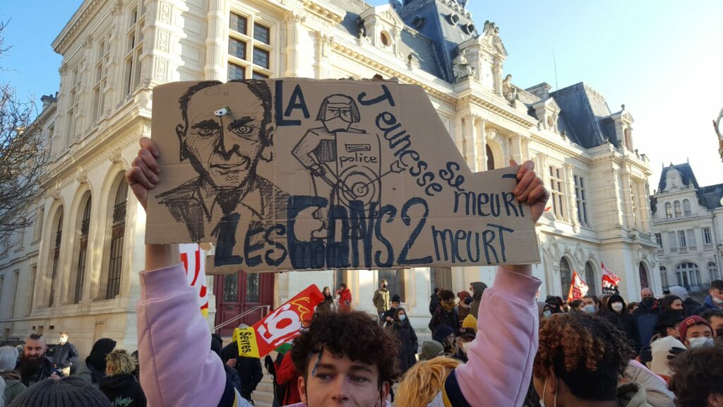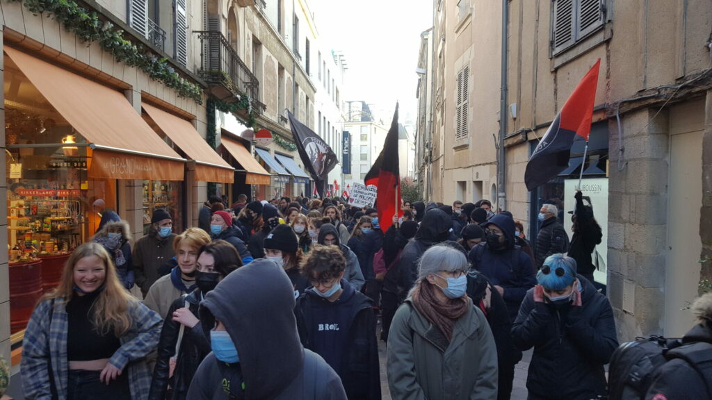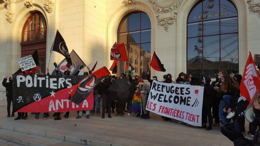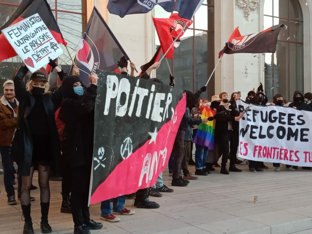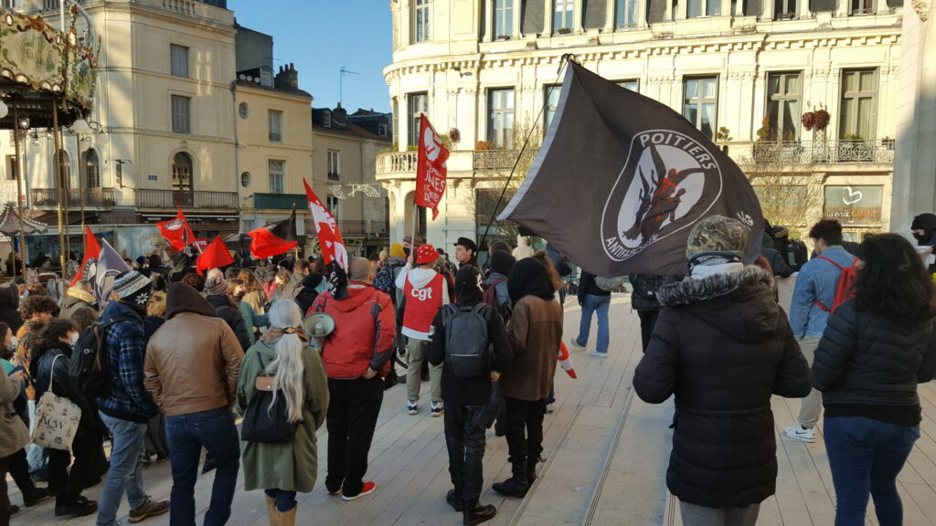 Ambiance assez étrange samedi 18 décembre dans le centre-ville de Poitiers où se mélangeaient, sous le soleil, badauds en pleine « fièvre acheteuse » et près de 600 manifestant.es présent.es à la fois pour manifester une solidarité constante avec les migrant.es pour un accueil digne et pour dénoncer la présence nauséabonde de l’extrême-droite, qu’elle prenne le visage des « zemmouriens », des « lepenistes », des amis de Zioti (comme le surnomme maintenant Le Canard Enchaîné !) dans les médias et ailleurs. Poitiers ne fait pas exception à la règle avec l’apparition récente d’affiches, de tags (sur l’université) ou d’autocollants de zemmour… vite arrachés mais significatifs de l’ambiance du moment.