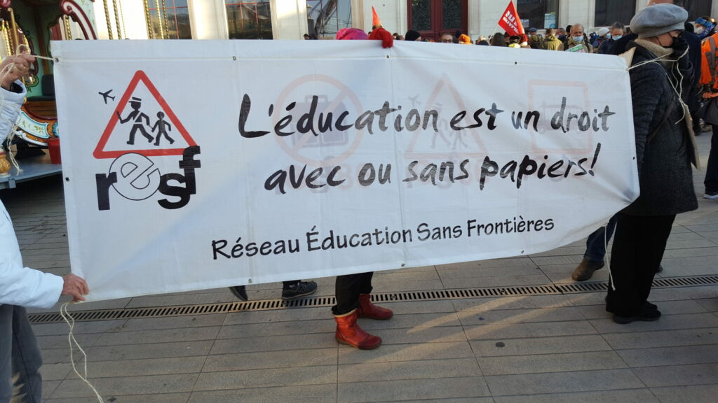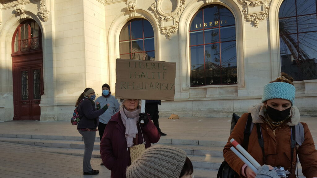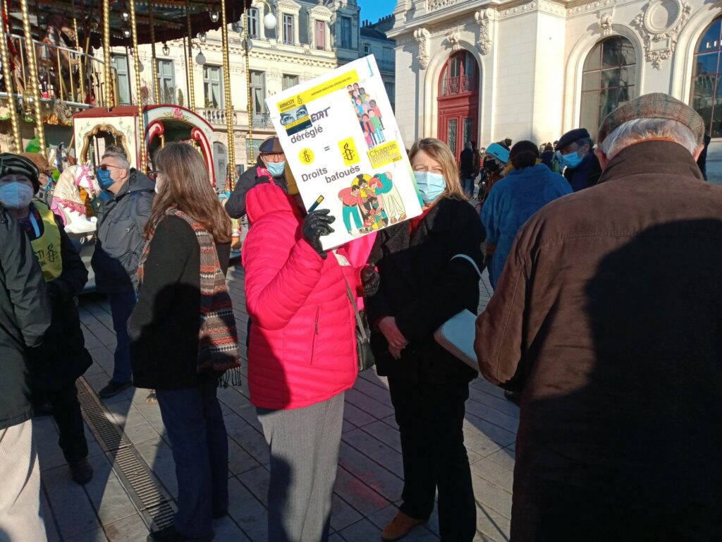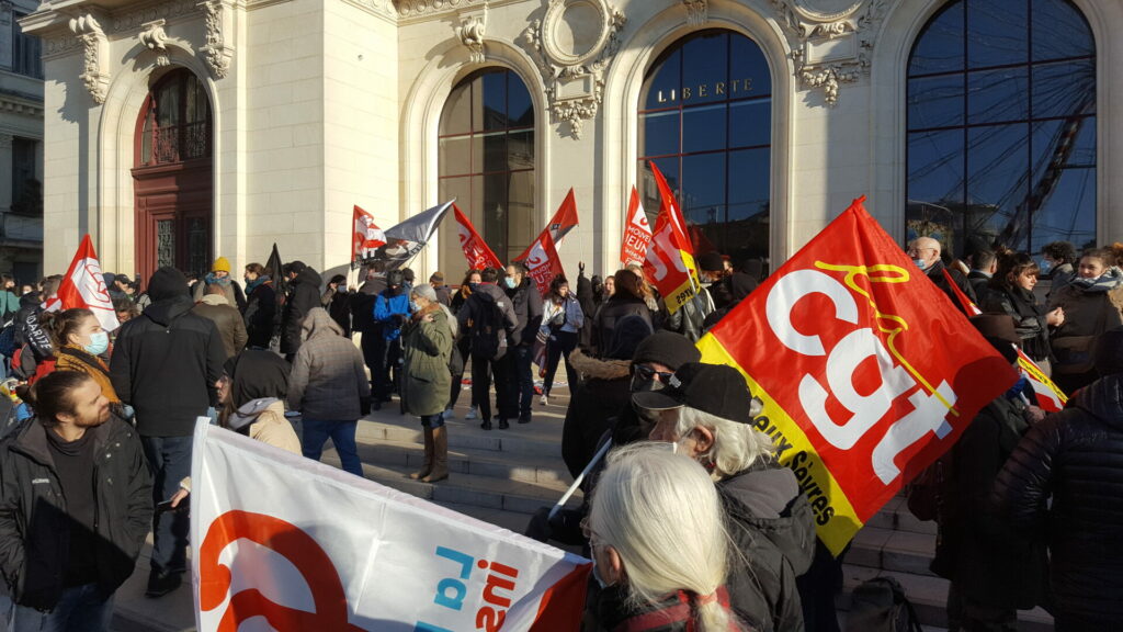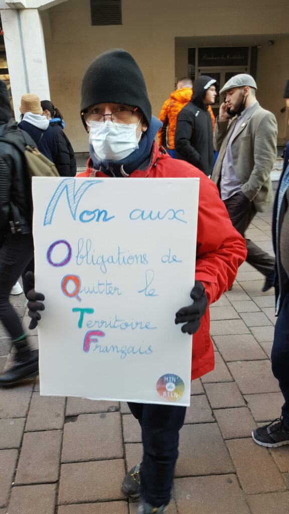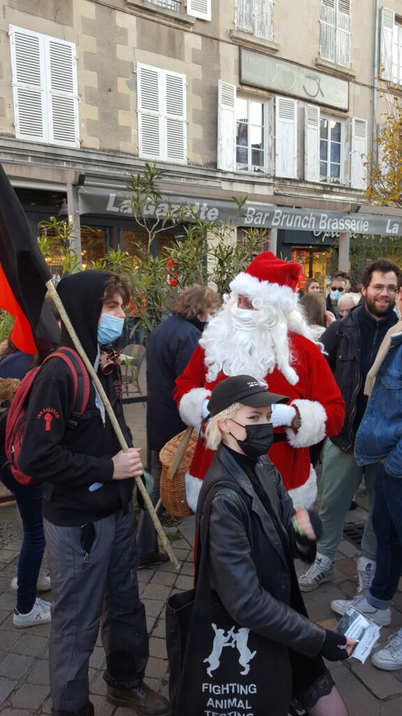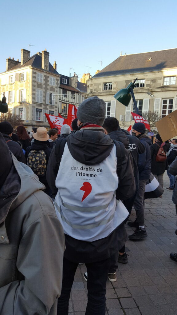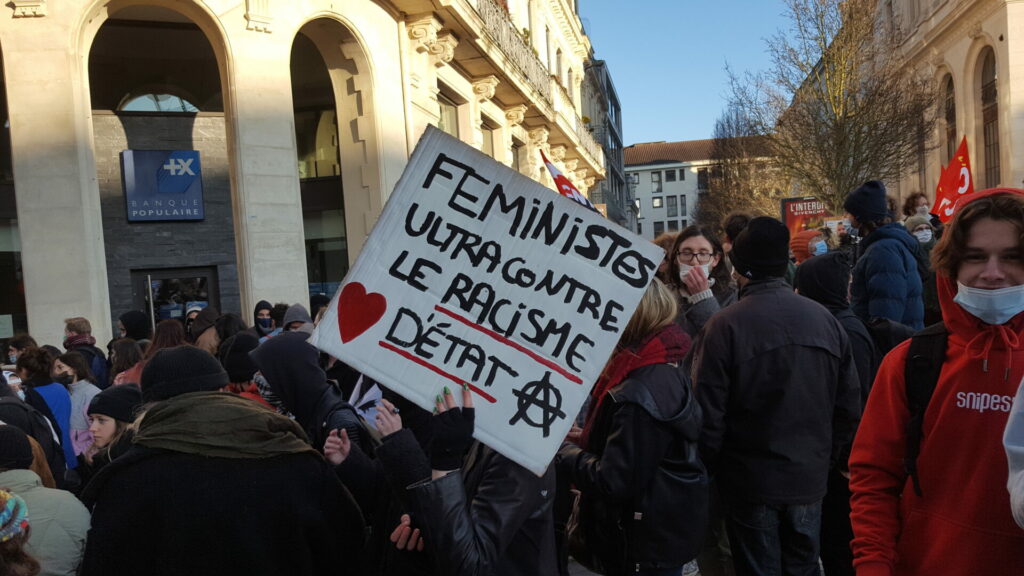 Ambiance assez étrange samedi 18 décembre dans le centre-ville de Poitiers où se mélangeaient, sous le soleil, badauds en pleine « fièvre acheteuse » et près de 600 manifestant.es présent.es à la fois pour manifester une solidarité constante avec les migrant.es pour un accueil digne et pour dénoncer la présence nauséabonde de l’extrême-droite, qu’elle prenne le visage des « zemmouriens », des « lepenistes », des amis de Zioti (comme le surnomme maintenant Le Canard Enchaîné !) dans les médias et ailleurs. Poitiers ne fait pas exception à la règle avec l’apparition récente d’affiches, de tags (sur l’université) ou d’autocollants de zemmour… vite arrachés mais significatifs de l’ambiance du moment.