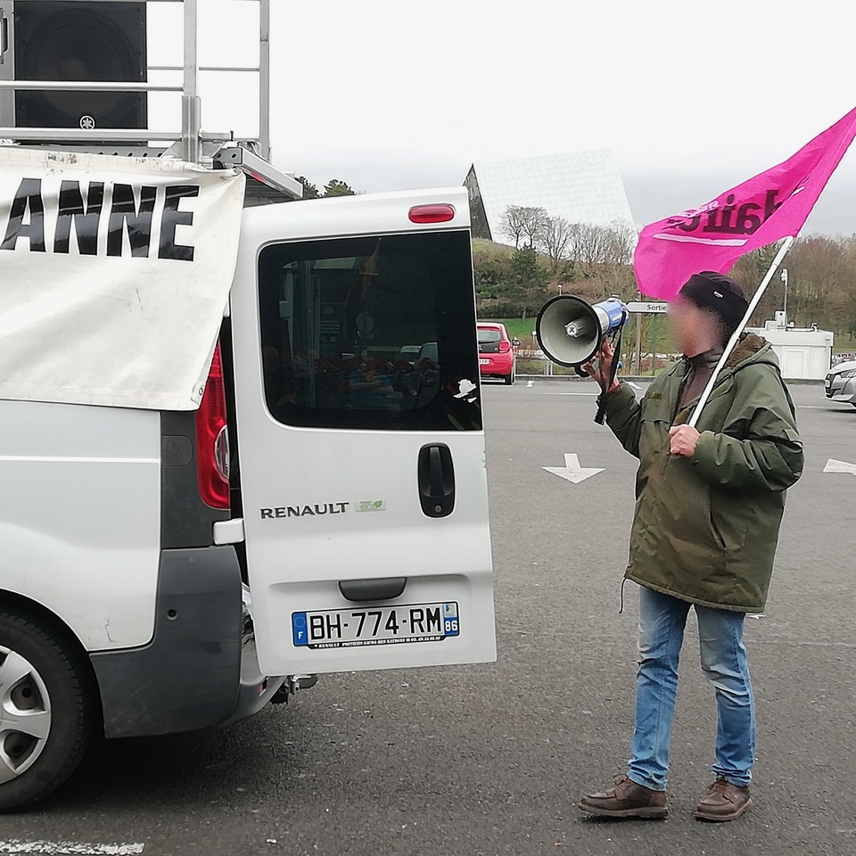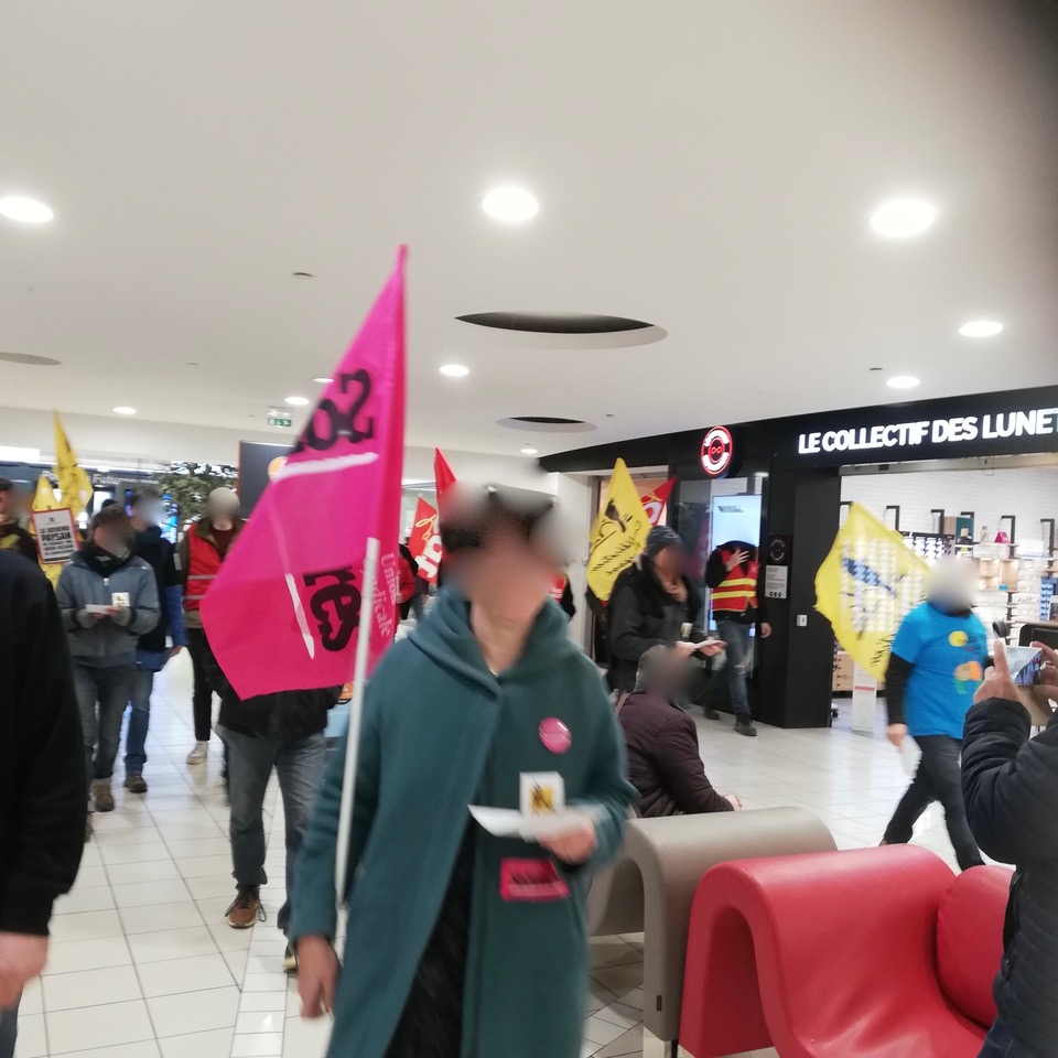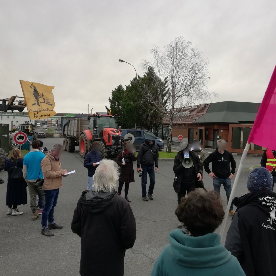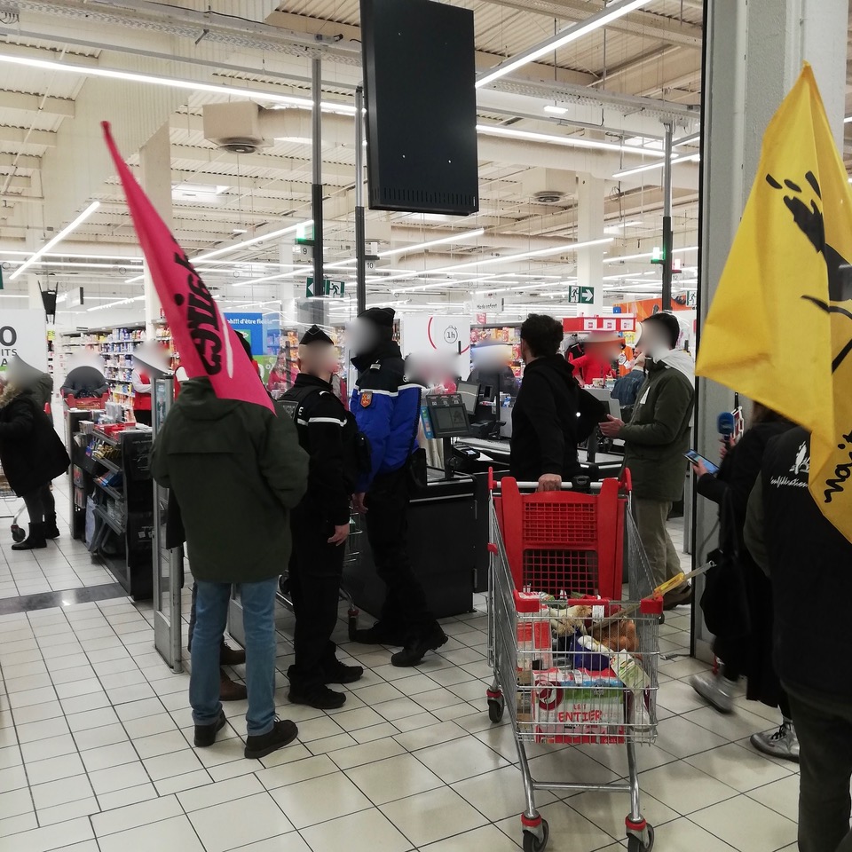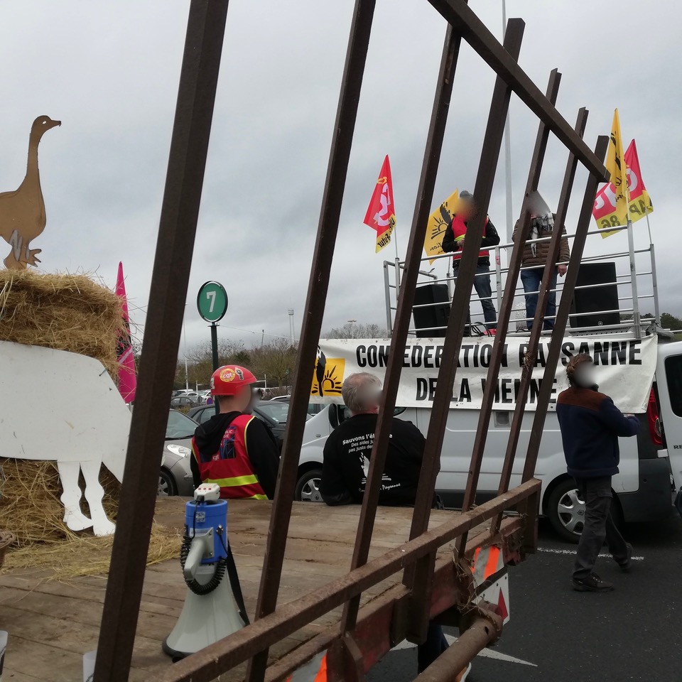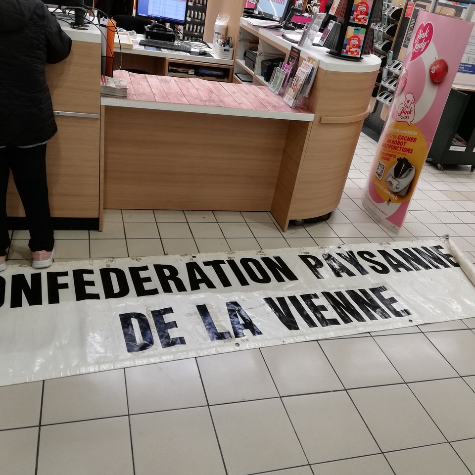 Ça commence vendredi matin devant le Macdo de Chasseneuil (qui s’est calfeutré devant pour la menace d’un envahissement… malbouffe oblige !) avant de partir en convoi vers Poitiers-Sud (une cinquantaine de véhicules automobiles avec la Confédération Paysanne, la CGT et Solidaires) pour une action « coup de poing » (sans coup de poing bien entendu !!!) dans la grande surface locale. Très vite, le responsable du magasin arrive, accepte que le « pourquoi de la présence des manifestant.e.s » soit diffusé dans la sono du magasin… Avec distribution de tracts à la clé. Pendant ce temps-là, les charriots en « sortie libre » de produits alimentaires commencent à quitter le magasin. Mais un vigile s’interpose « c’est du vol » ! les forces de l’ordre ne tardent pas à arriver et l’action se termine sur le parking de la zone commerciale. Une fois informé.e.s, ce fut une action comprise par les client.e.s du magasin, sous l’œil interloqué des personnels de caisse et l’œil non moins inquiet du gérant.
