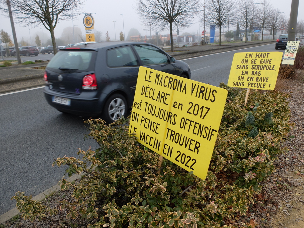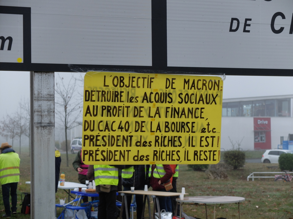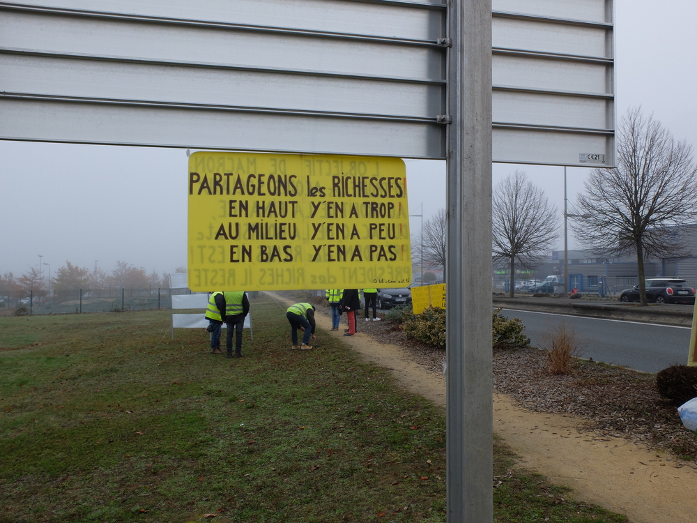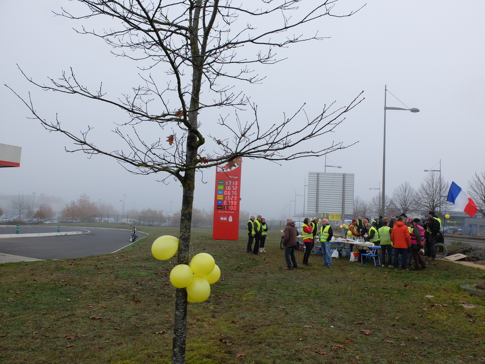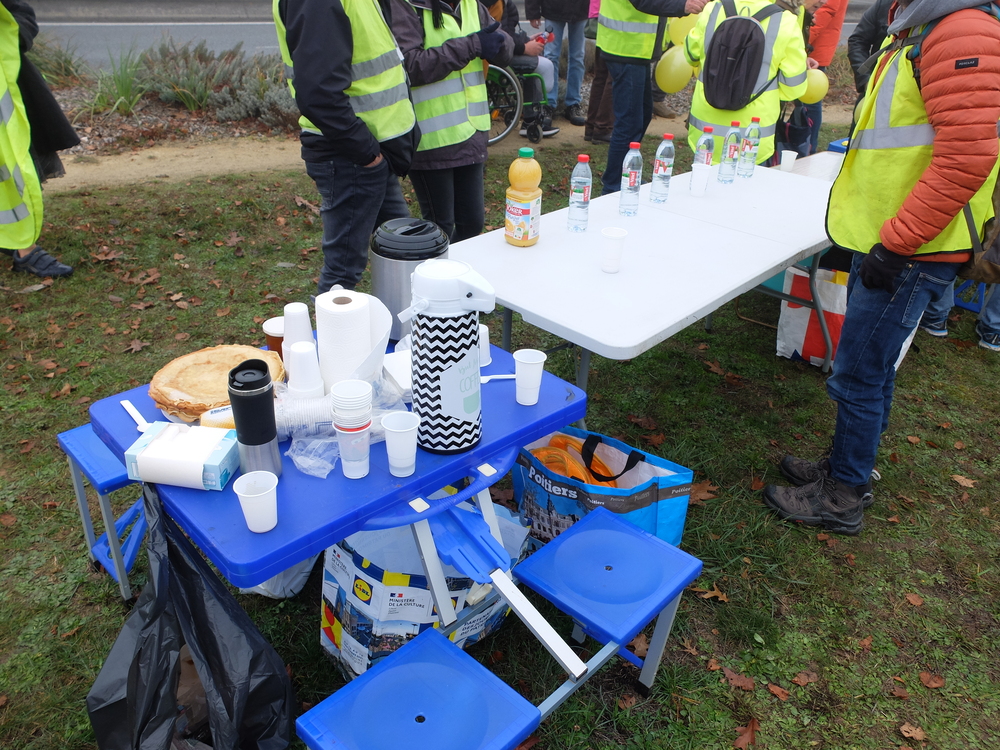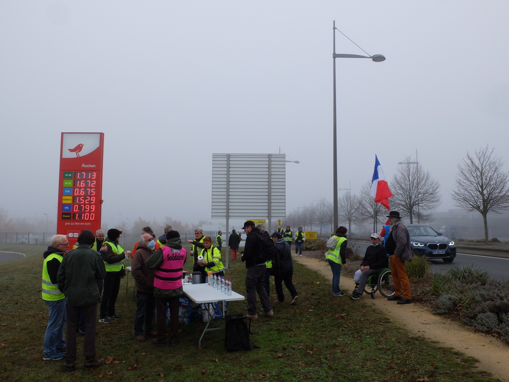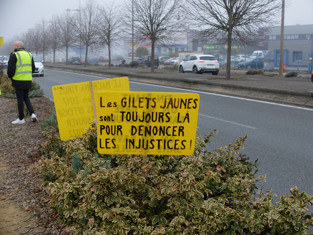 C’est par un froid brouillard que les Gilets jaunes de Poitiers Sud avaient appelé la population à les rejoindre cette fois-ci à partir de 11h00. Ielles avaient reçu le soutien de Solidaires 86. Ielles étaient entre 30 et 40 seulement mais on pouvait entendre un très fort soutien continu par klaxon d’une partie importante des personnes qui circulaient. 3 ans après, les problèmes restent entiers et les courageux/euses qui manifestent chaque samedi le rappellent malgré le flot de blabla des médias nationaux. Les pancartes rappellent que le problème de fond c’est pas « l’islam » mais bien la justice fiscale et sociale. Qu’on se le dise, qu’on les rejoigne chaque samedi à 14h30.