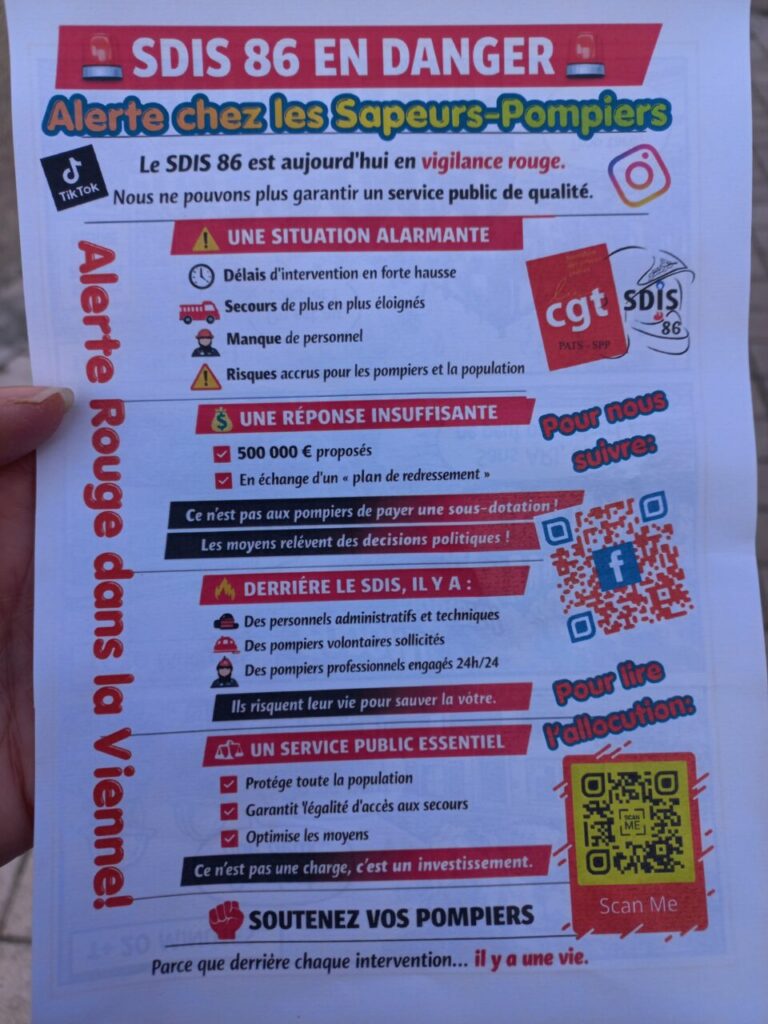 Mobilisation ce vendredi 3 avril devant le conseil départemental de la Vienne : la raison ? Le manque de moyens des pompiers de la Vienne et l’attitude des élu.es majoritaires qui font la sourde oreille…