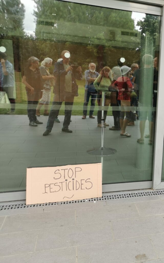 Nous avons distribué un flyer pour dénoncer la pollution de l’eau en particulier le métabolite et de sensibiliser les élus sur leur responsabilité sur la santé publique.