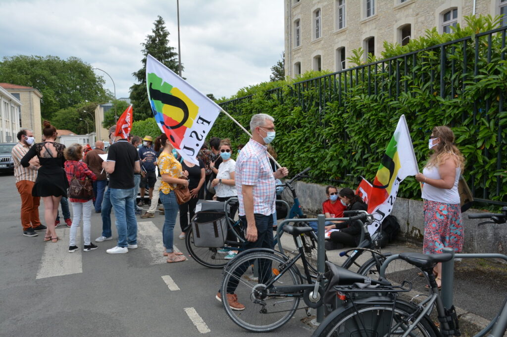 Rassemblement devant le rectorat jeudi 3 juin à Poitiers à l’appel de l’intersyndicale Vienne, (CGT éduc’action 86, CNT-SO 86, FNEC-FP-FO 86, FSU 86, SUD Education et Recherche 86), à l’occasion d’une journée de grève nationale. Les revendications des AESH portent sur l’amélioration des salaires, (d’autant plus faibles que les contrats sont rarement à temps complet) la création d’un véritable statut de la Fonction Publique, contre les PIAL (Pôles Inclusifs d’Accompagnement Localisés) et la précarité. Le manque de moyens, c’est aussi le manque de postes qu’il faudrait ouvrir pour assurer un accompagnement à la hauteur des enjeux, l’intégration réussie des élèves en situation de handicap. Un mouvement qui, sans doute n’a pas mobilisé en nombre mais qui témoigne d’une grande colère et de la frustration de tous ces personnels qui sont aujourd’hui indispensables au fonctionnement des écoles et des établissements du second degré. Indispensables… mais maltraités !