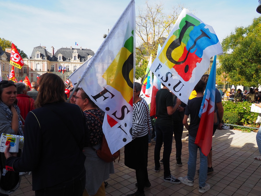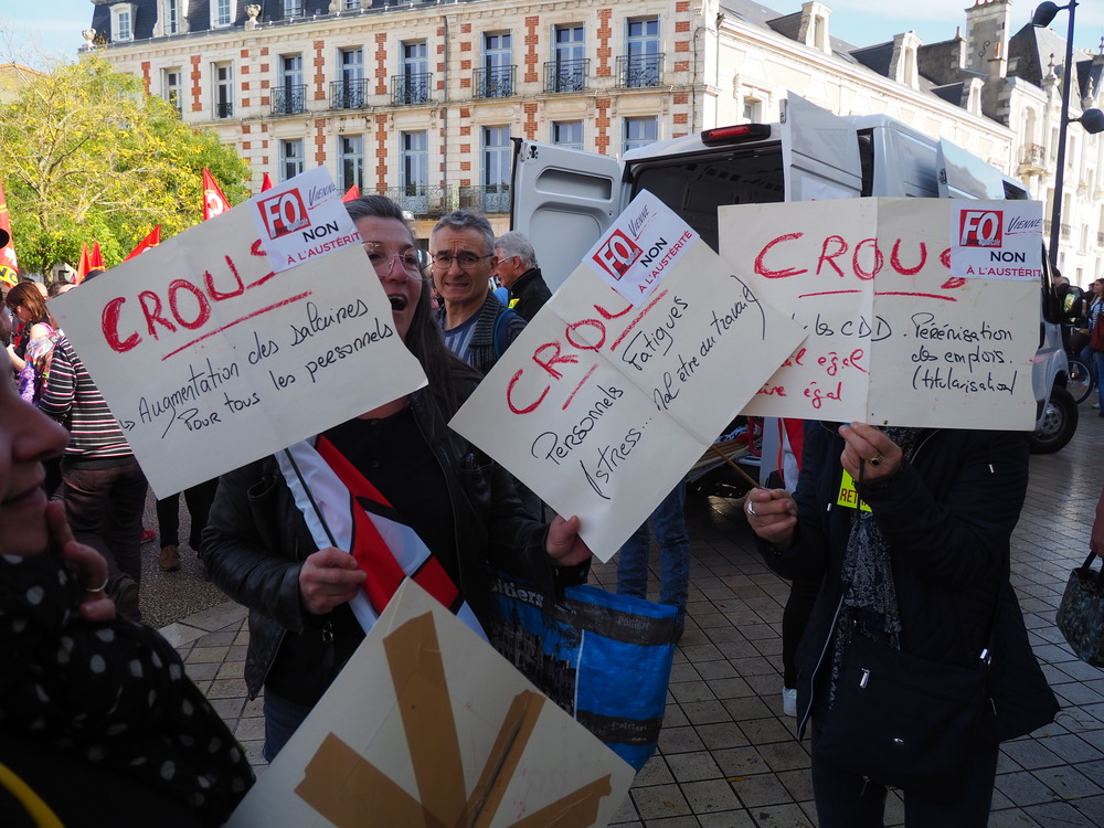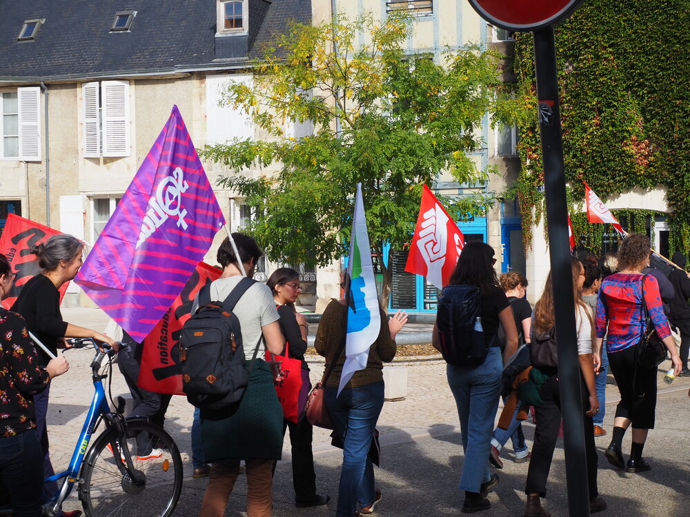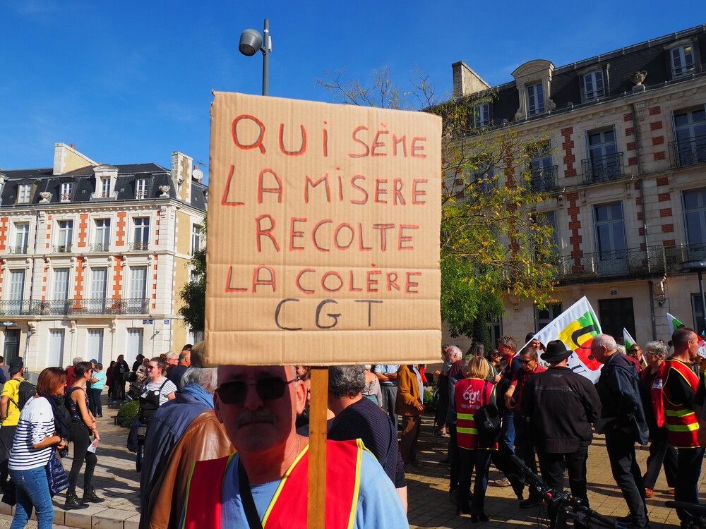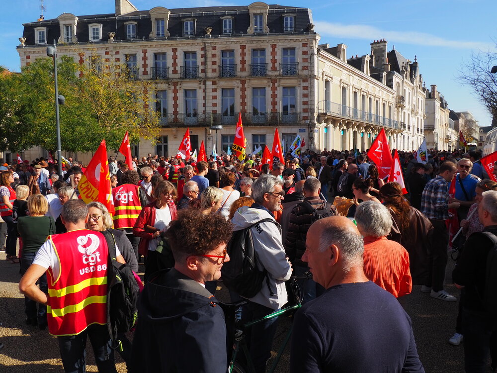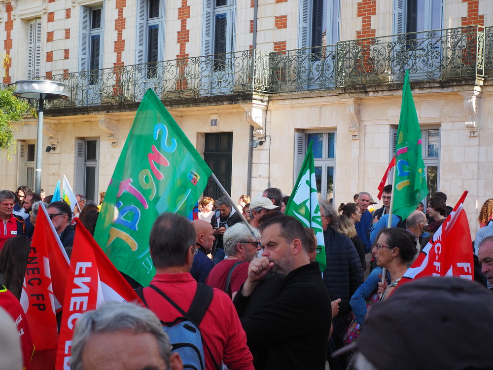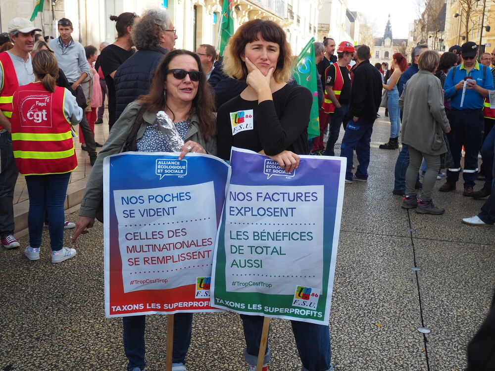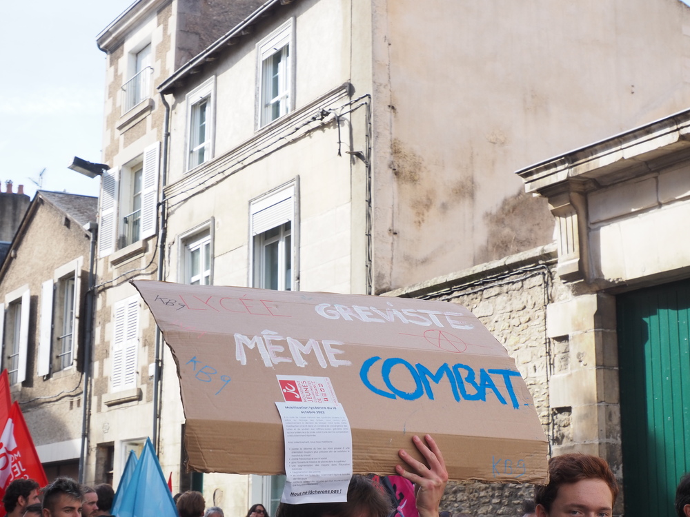 La suite du mouvement était dans toutes les conversations ! Il y avait du monde (de 800 à un millier ?) dans les rues de Poitiers ce mardi 18 octobre, mélange de lycéen.nes, salarié.es, retraité.es, du monde d’un peu partout, du monde se demandant si le mouvement commençait aujourd’hui, s’il allait se développer, s’arrêter, bref si on était au début de quelque chose d’ampleur. On sent bien que ça frémit, que ça se cherche, qu’ici et là ça se mobilise plus que d’habitude, sans que ce soit le « raz de marée » … Pas mal de monde de différents secteurs, du public, du privé, du secteur associatif,…