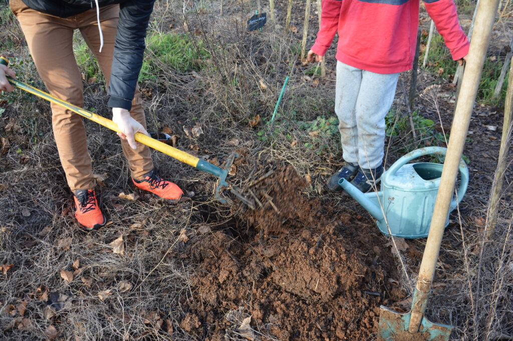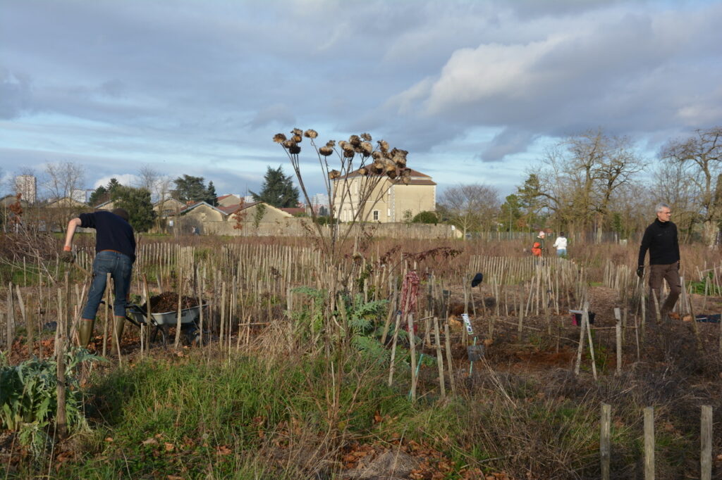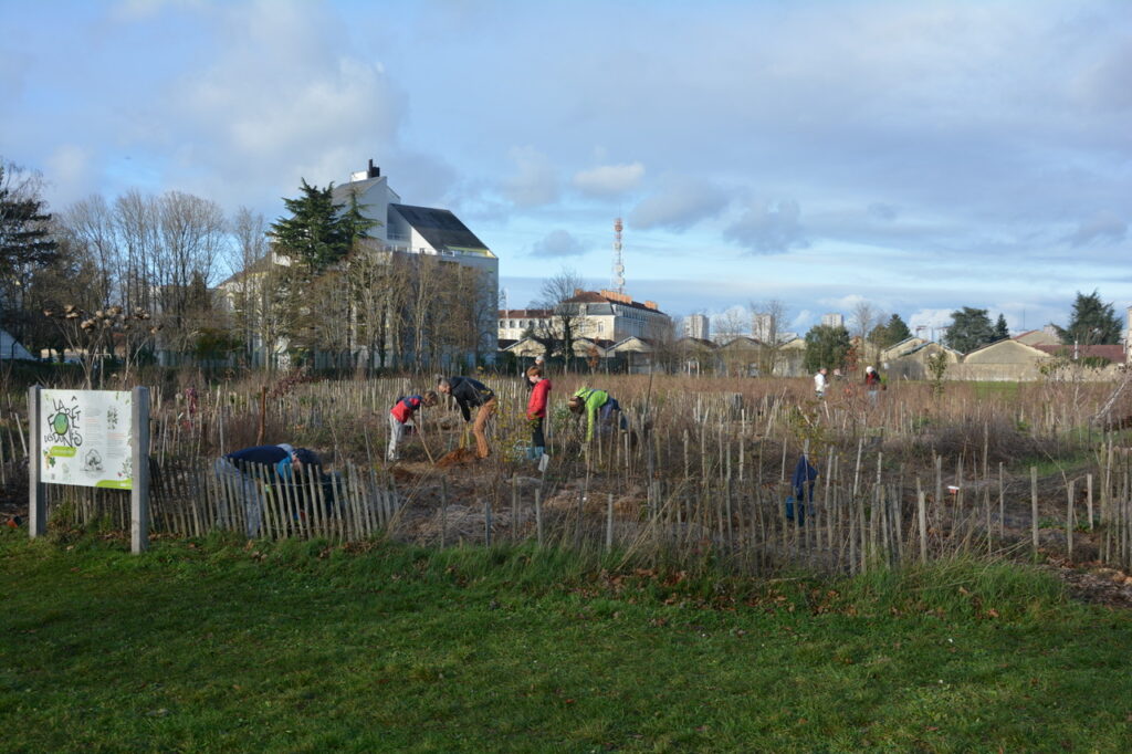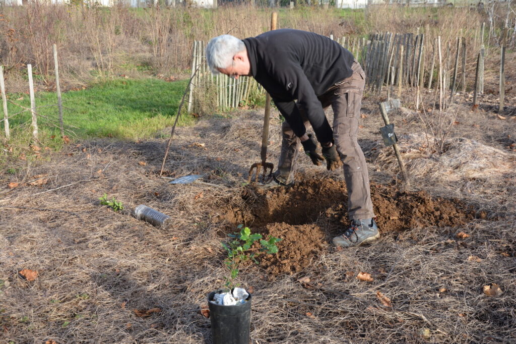 Dimanche 14 décembre, nouvel après-midi de plantation et de paillage au parc des Dunes. (comme tout le monde l’appelle maintenant) Un lieu que de nombreux riverains, et au delà, se sont appropriés, un lieu vivant où pique-niquer, jouer et flâner est devenu habituel. Un constat : ça pousse bien et l’année pluvieuse que nous connaissons y est pour quelque chose. Au regard de la constitution du sous-sol très karstique avec peu de terre pour permettre aux arbres de s’enraciner profondément, c’est une chance. Cette pluie bénéfique pour les jeunes plantations aura limité la mortalité qui dans la 1ère année est souvent importante. Le travail fourni par les bénévoles du Collectif des Dunes y est aussi pour quelque chose ! Ce dimanche, de jeunes plants d’arbres et des plantes vivaces ont été mis en terre par une quinzaine de personnes qui se sont relayées jusqu’à 16 h, plantation et paillage suivi d’un goûter sur place. Et comme le soleil brillait largement, ce fut d’autant plus apprécié.