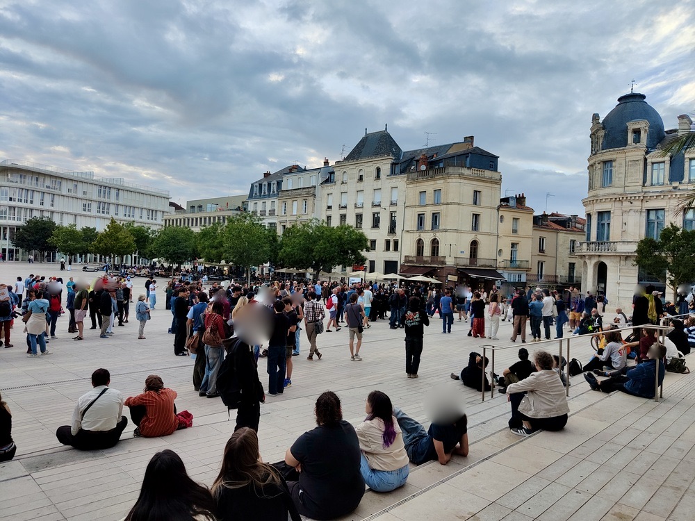 Ça a commencé doucement vers 19 h (l’annonce du renversement du maire de Pau étant intervenue un peu avant 19 h) et progressivement la place de la mairie s’est couverte de monde. Environ 250 personnes au plus fort du rassemblement appelé à Poitiers comme partout en France, pour marquer le coup, comme on dit.