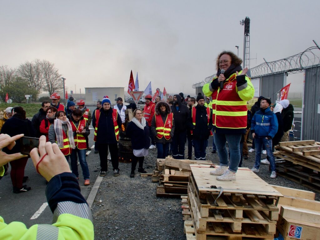 L’intersyndicale était au grand complet : CGT, FO, CFDT, FSU, SUD, CGC, CFTC et Christelle Pepoli faisait le point debout sur un podium de palettes. (photo 1)