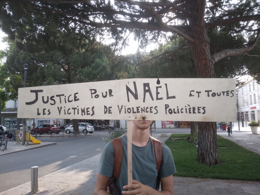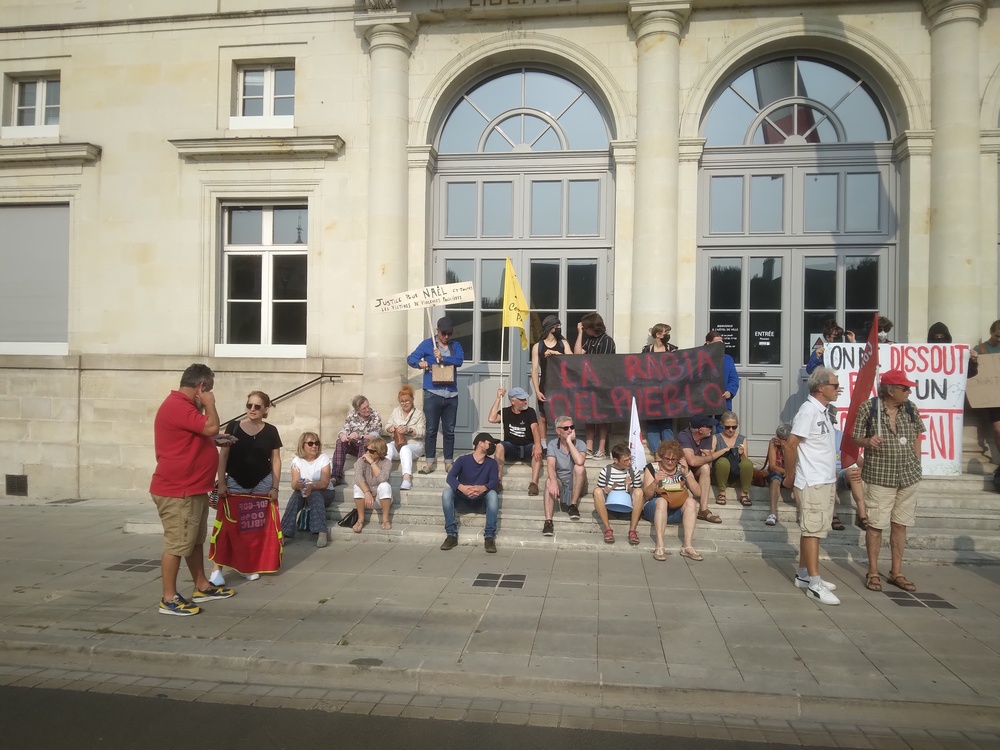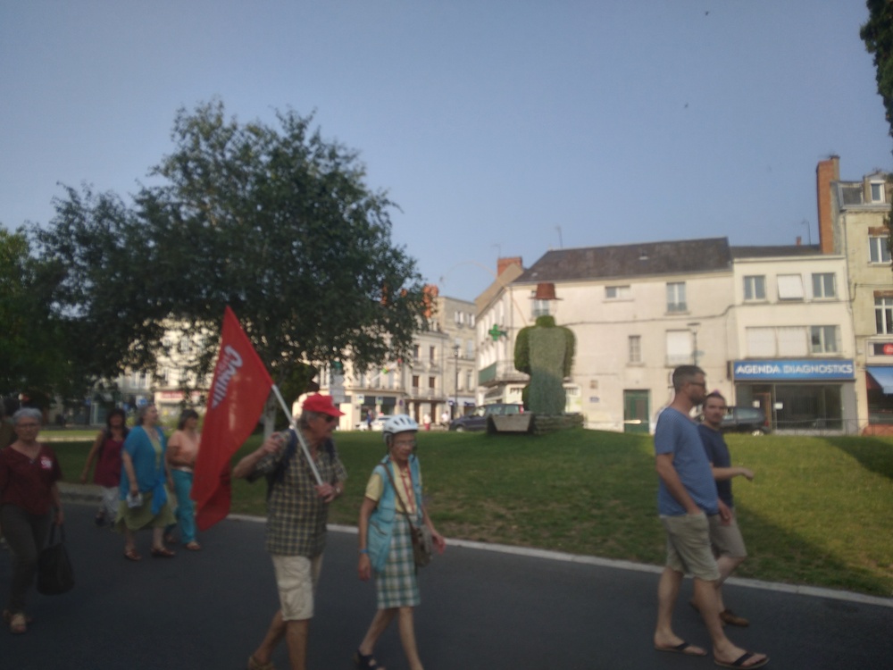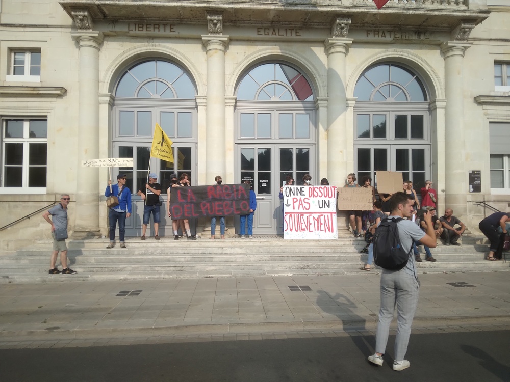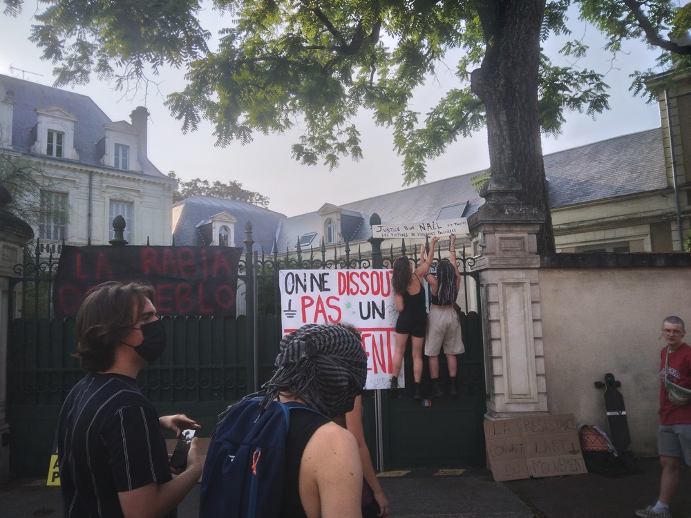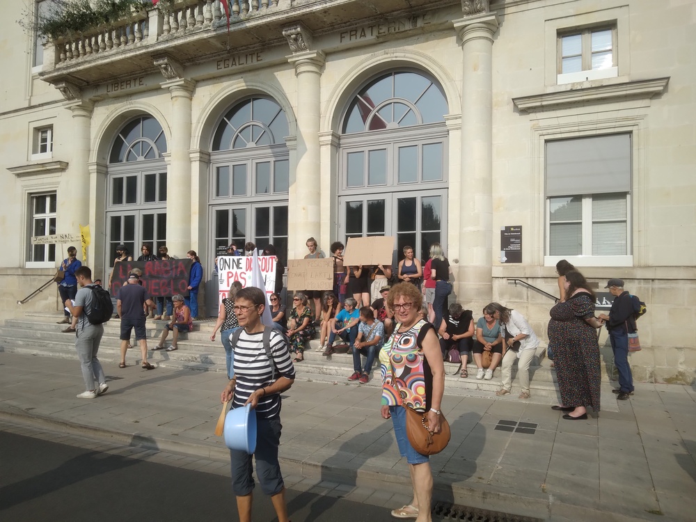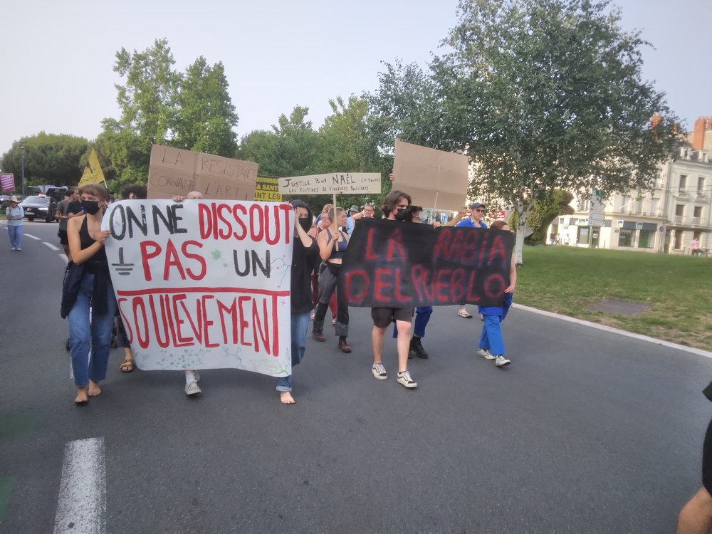 Nous nous sommes rassemblés, environ une centaine, à 18 h 30 devant l’hôtel de ville. Nous sommes partis ensuite en manifestation sur le boulevard Blossac, nous avons contourné le jet d’eau puis avons marché jusqu’à la sous-préfecture. le cortège était dynamique, coloré, avec des jeunes « déter », Parmi les slogans entendus : « La police tue », « La police mutile » et « Châtell Antifa » …