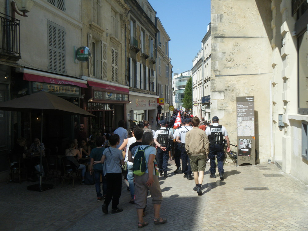 Après les prises de paroles des représentant-es des organisations, nous avons déambulé dans les rues piétonnes du centre-ville, en toute tranquillité, sous la surveillance des policiers en civil et en uniforme dont la présence rappelait aux manifestant-es et aux passant-es que protester c’est aller contre le Régime en place et que le Régime en place il a le pouvoir à savoir le chéquier et la matraque.