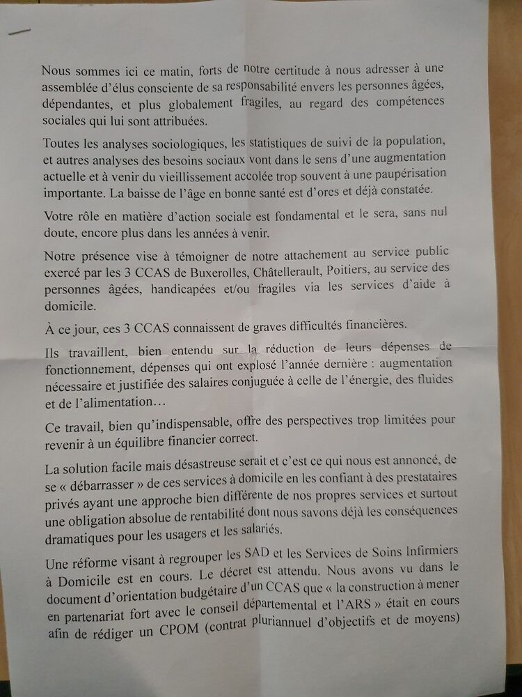 Une élue PS de Châtellerault présente parmi les manifestant-es a lu le texte ci-dessous :