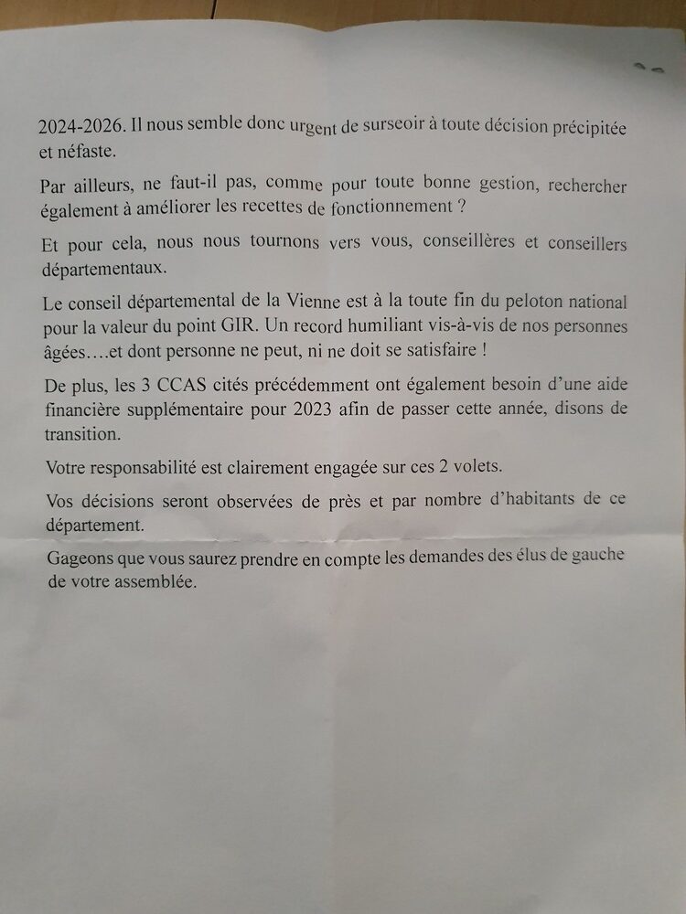 Un rassemblement avait été appelé par les élu-es de gauche du Conseil Départemental (CD) de la Vienne pour que 10% des réserves issues de l’excédent budgétaire 2022 du Département aillent aux CCAS (Centre Communale d’Action Sociale) en difficulté ( voir l’appel et le détail ici).