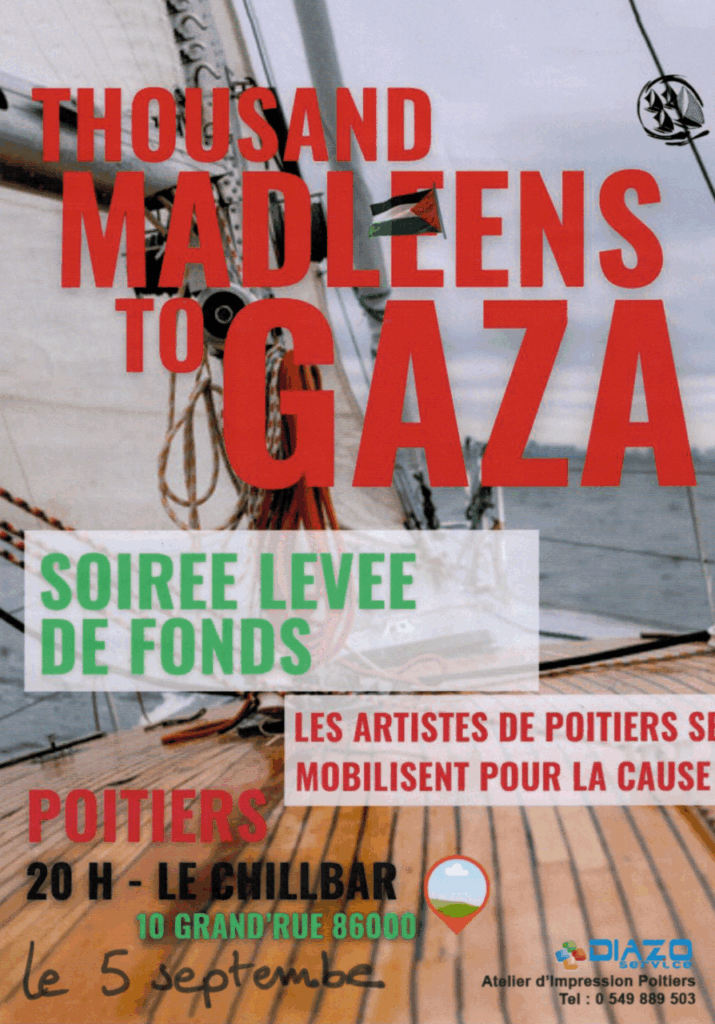Un membre du comité poitevin « Thousand Madleens to Gaza » a appelé au soutien financier à ces flottilles et invite à une soirée de soutien le 5 septembre à Poitiers (affiche en fin d’article).