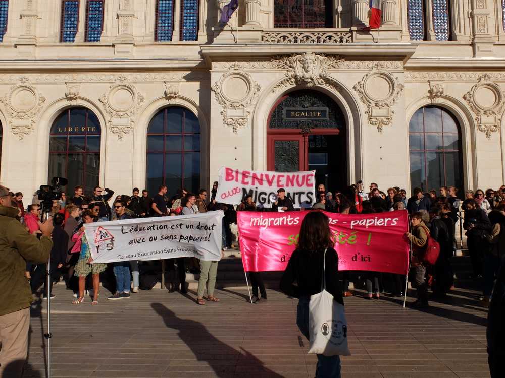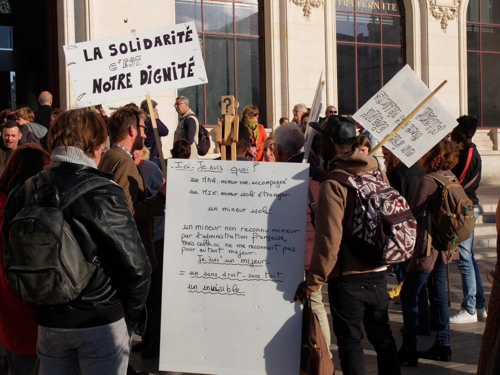 Il y avait du monde dès 18h00 pour ce rassemblement en faveur d’une solution d’hébergement de jeunes migrants qui sont actuellement dans « la maison » et qui sont menacé d’expulsion à tout moment. L’enjeu du rassemblement était d’interpeller le maire de Poitiers, A. Claeys, au début du Conseil municipal de ce soir, pour qu’il use de son pouvoir afin que préfecture (qui peut retarder l’expulsion) et département (responsable de l’Aide Social à l’Enfance) cessent leur blocage.