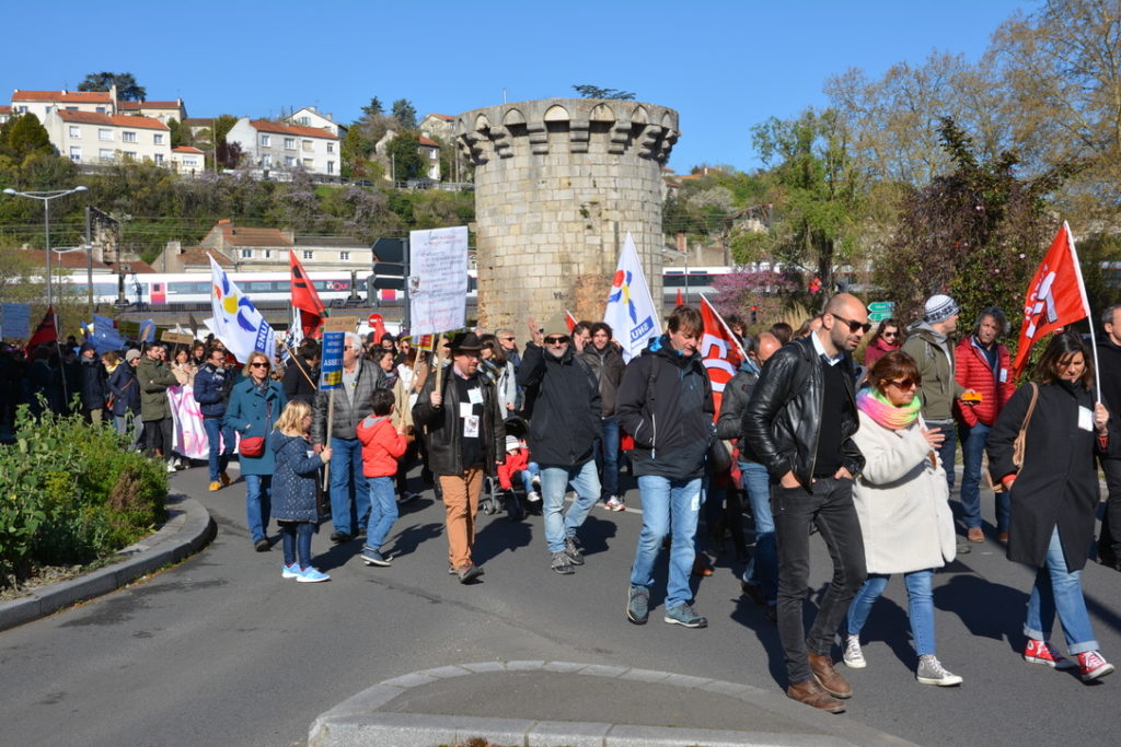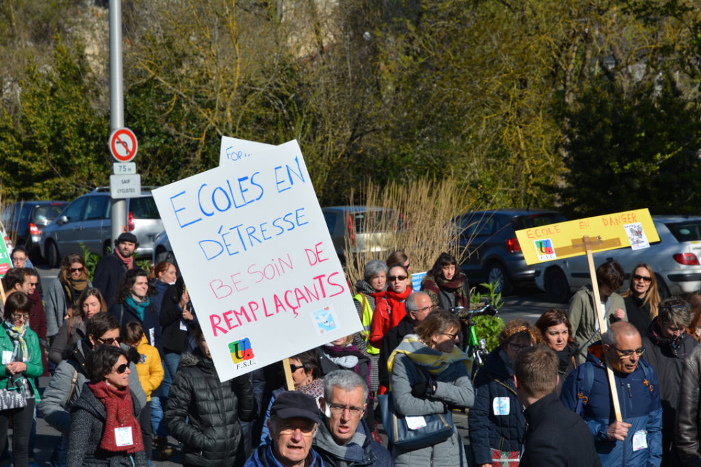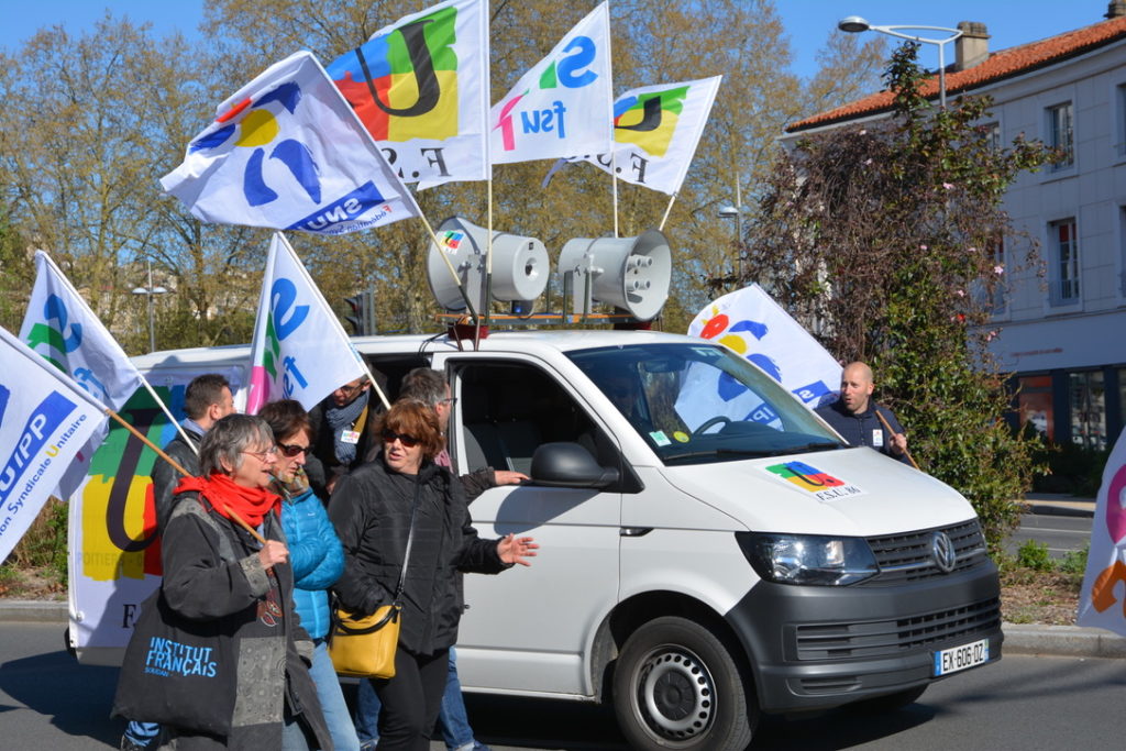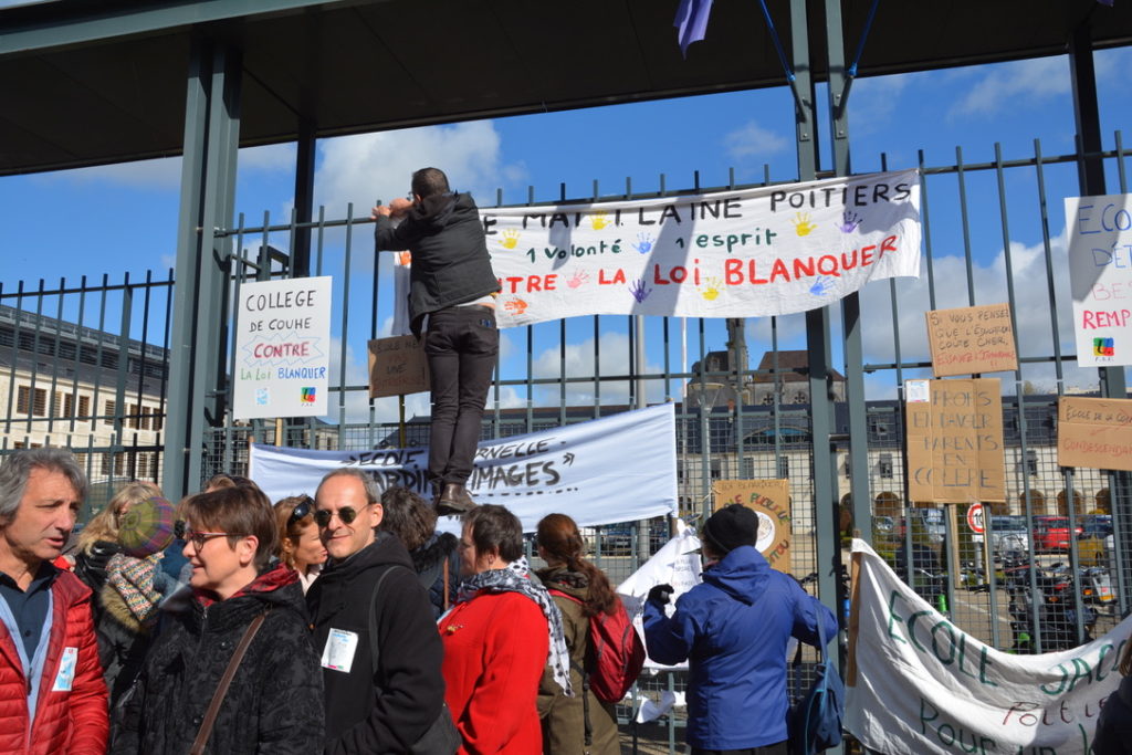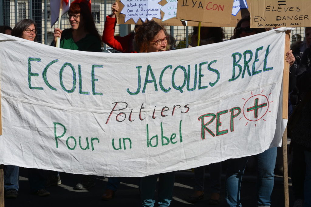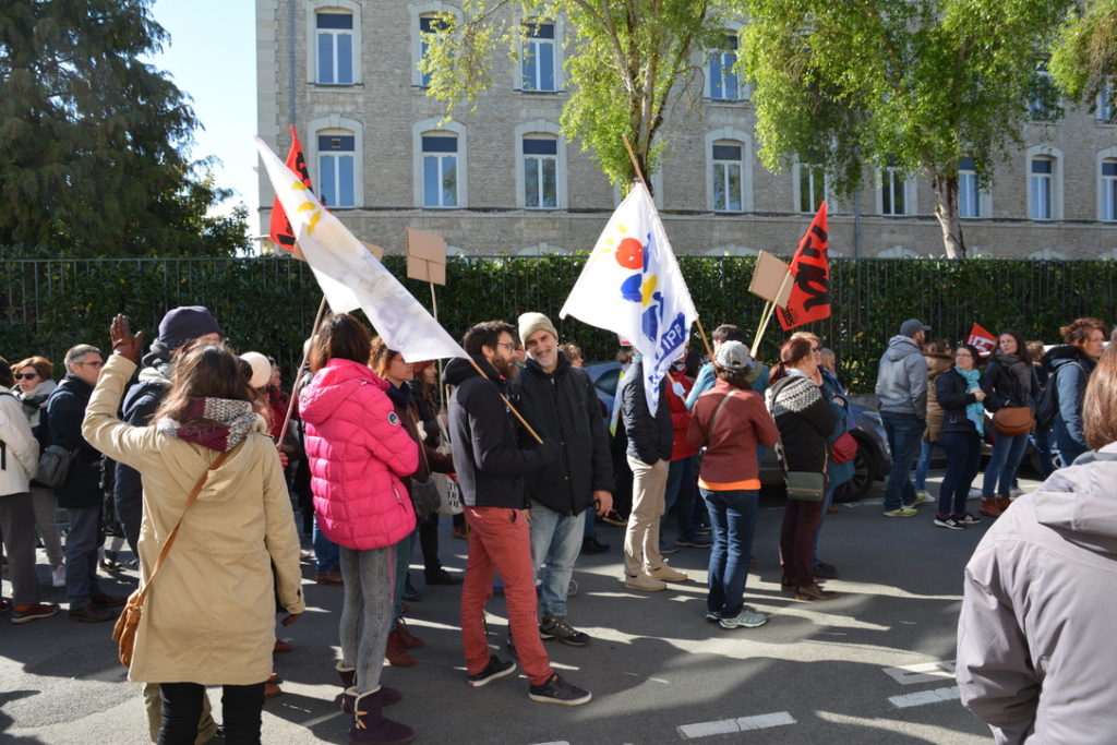 A l’appel de : SNUipp-FSU, SNEP-FSU, SNES-FSU, SNUEP-FSU, FNEC-FP-FO, CGT Éduc’action et Sud Éducation, entre 400 et 500 personnels enseignants 1er et 2nd degrés ont participé à cette manifestation de la porte de Paris au Rectorat de Poitiers avant de se diriger vers un amphi de la fac de droit en centre-ville pour une assemblée générale destinée à donner une suite au mouvement.