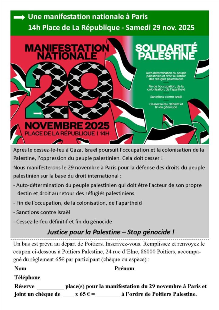 Rappel également de la prochaine manifestation nationale à Paris (place de la République) samedi 29 novembre en solidarité avec la Palestine. (avec la fiche d’inscription/soutien)