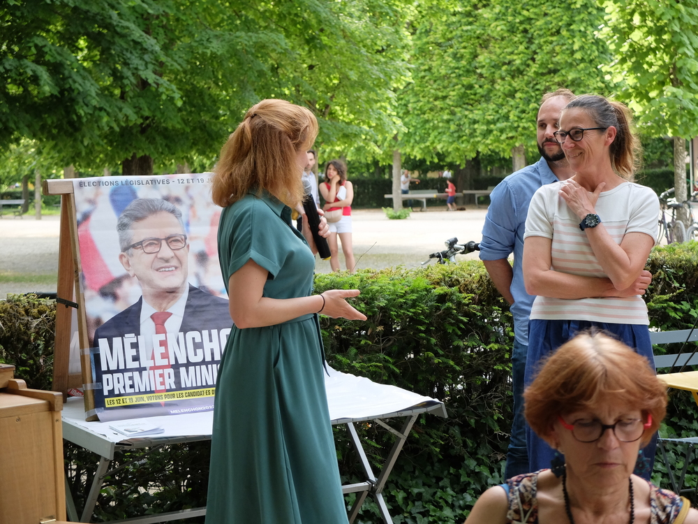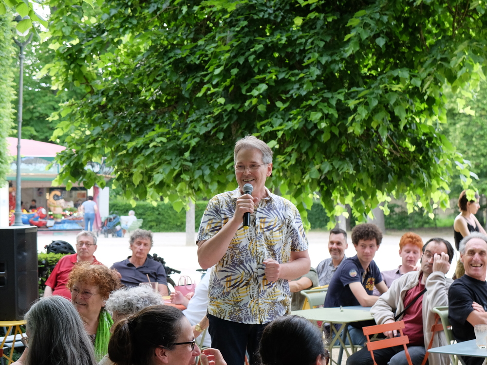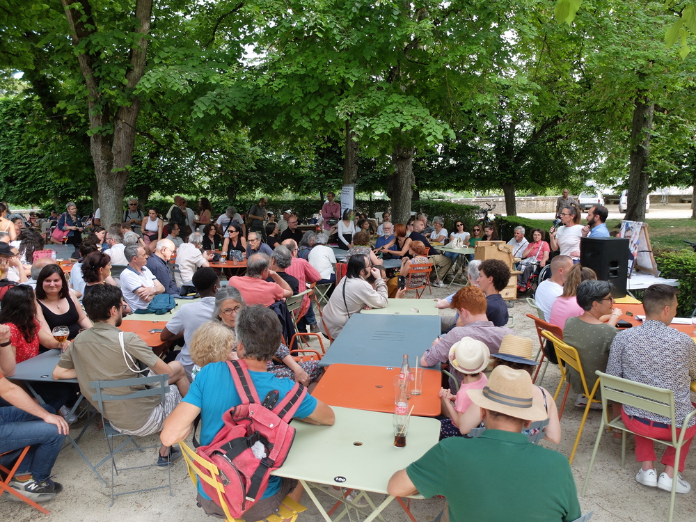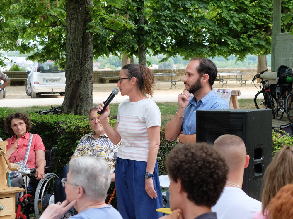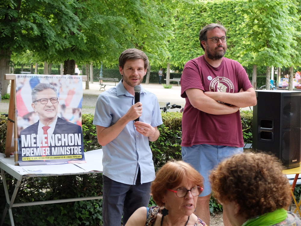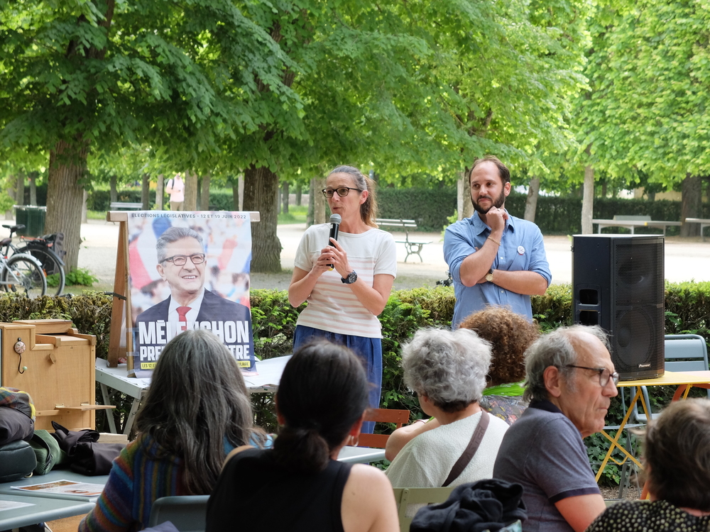 C’était ce samedi. Un peu plus de 150 personnes se sont données rendez-vous au bar du Parc de Blossac pour écouter les prises de paroles des candidat-es Valérie Soumaille et Aladin Lévêque de la Nouvelle Union Populaire Écologique et Sociale. Et écouter également l’orgue mécanique (de Gilles !) sur lequel nous avons chanté « Nous on veut continuer à danser encore » !