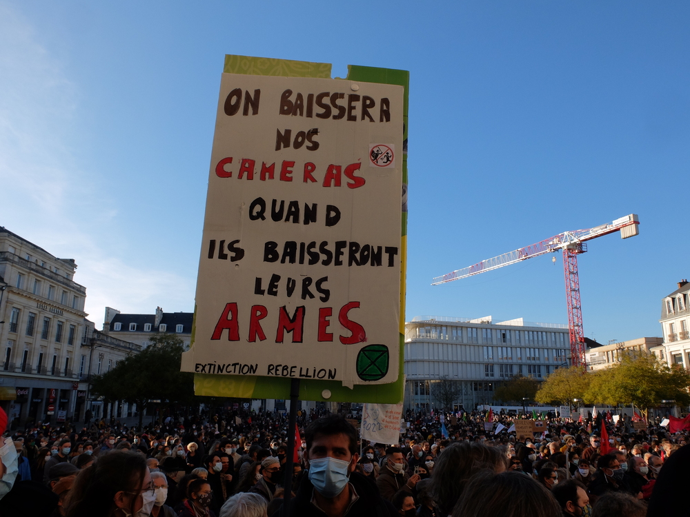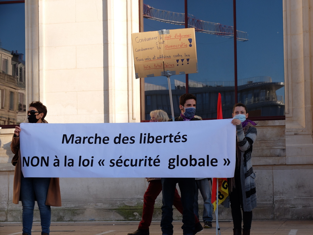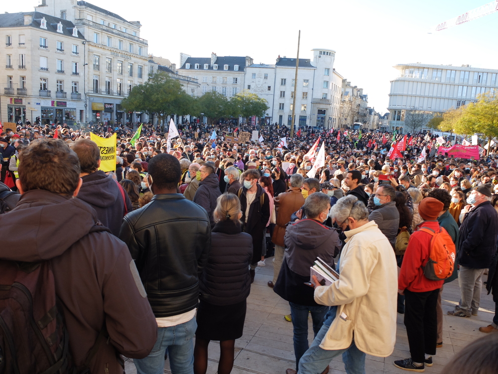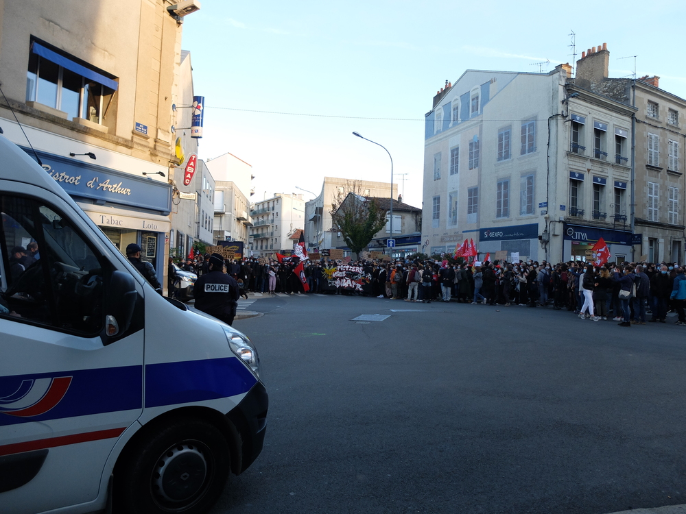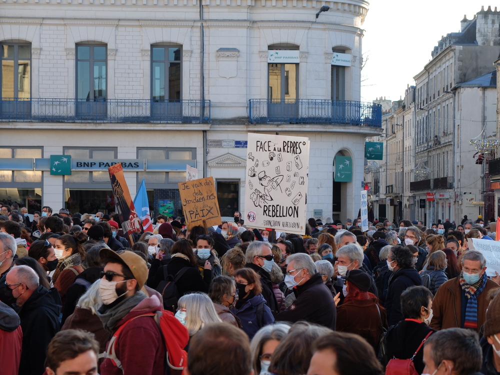 Au jeu des pronostics, on est sûr de gagner : beaucoup de monde à Poitiers aujourd’hui sur une place de la mairie envahie de personnes bien conscientes d’être là pour dire leur défiance, leur colère, leur émotion, une volonté commune d’arrêter cette insupportable dérive autoritaire du pouvoir en place. Alors combien ce samedi 28 novembre ? On annonce 2 000, sûrement plus mais à coup sûr bien au delà de la semaine passée. Il faut dire que l’on a été servi cette semaine avec une répression féroce de migrants à Paris suivie d’images d’une violence insupportable contre un producteur de musique… avec les conséquences que l’on connaît. Triste litanie de l’aveuglement de ce pouvoir et d’autres avant lui : loi travail, gilets jaunes, retraites, personnels soignants, avocats,… la liste ne fait que s’allonger.